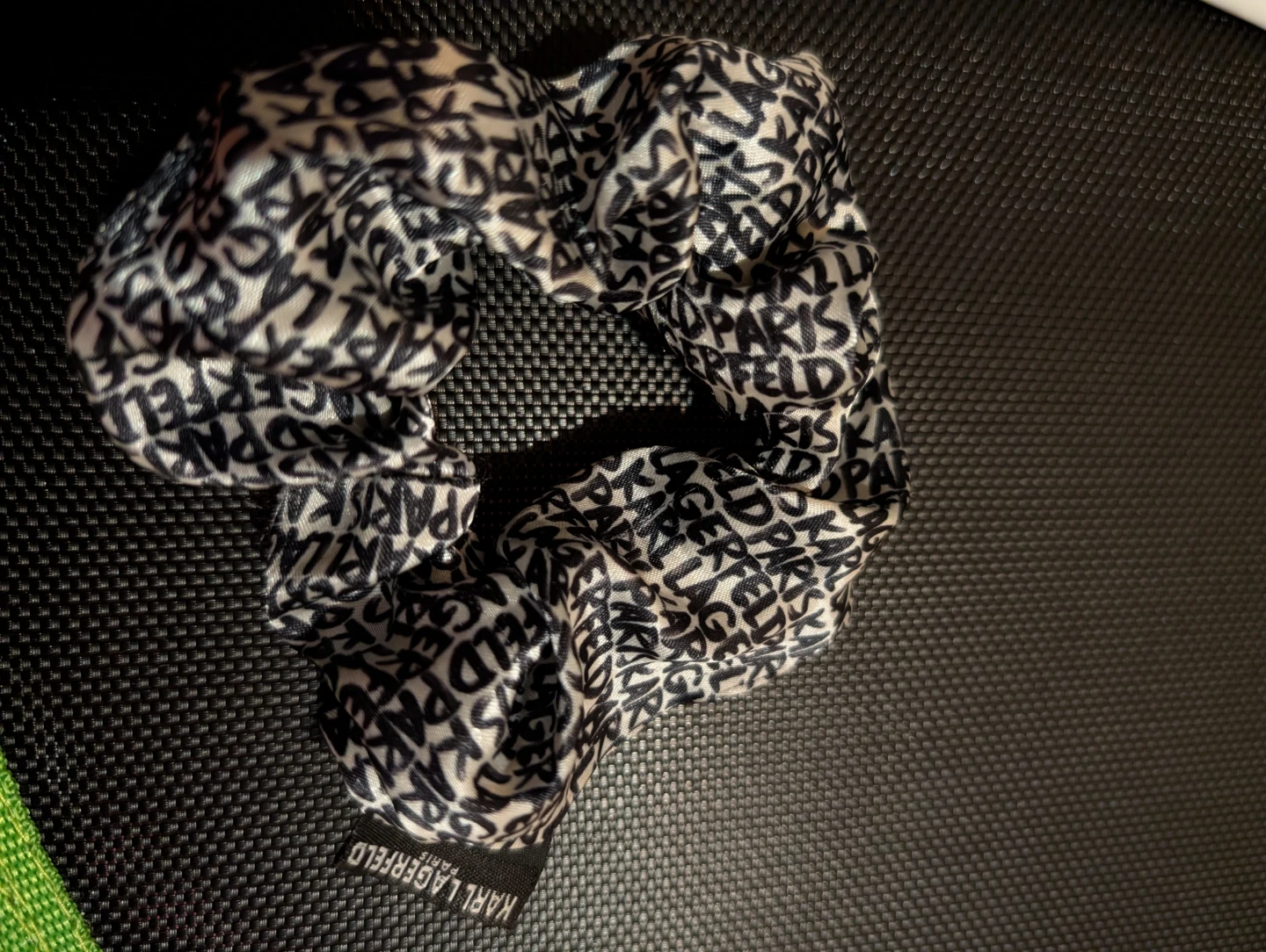 This is a Karl Lagerfeld Paris scrunchie with a repeating logo print. It's made of a silky material. Adds a touch of designer flair to any hairstyle!
