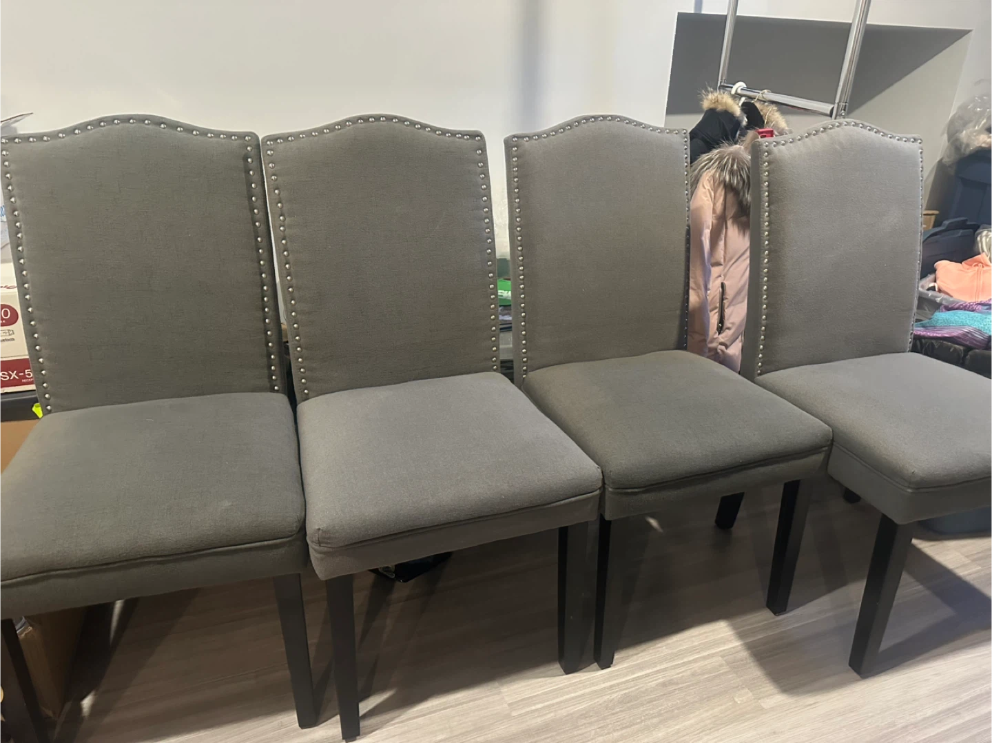 Selling a set of four dining chairs. They're upholstered in a neutral grey fabric and feature a decorative nailhead trim. Usually around 100 per chair.
