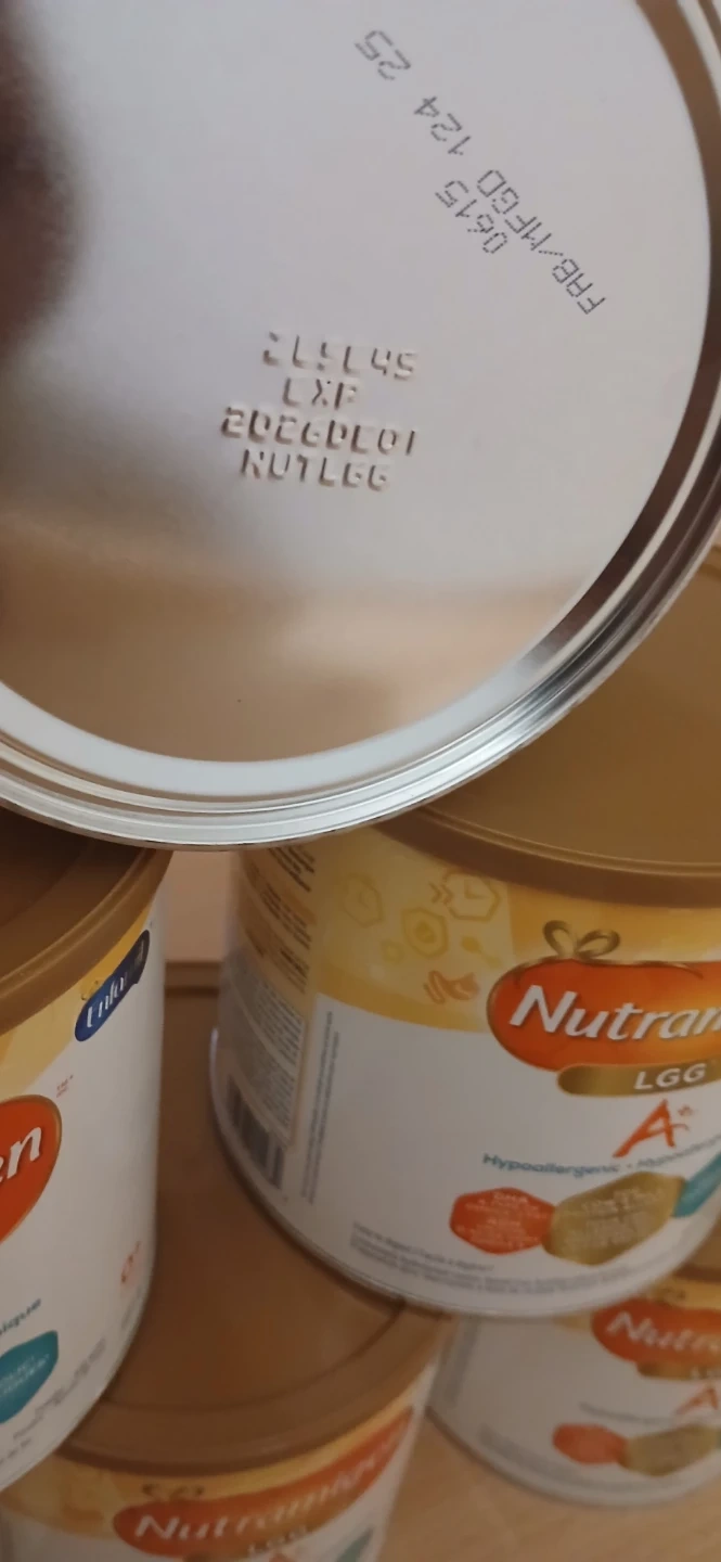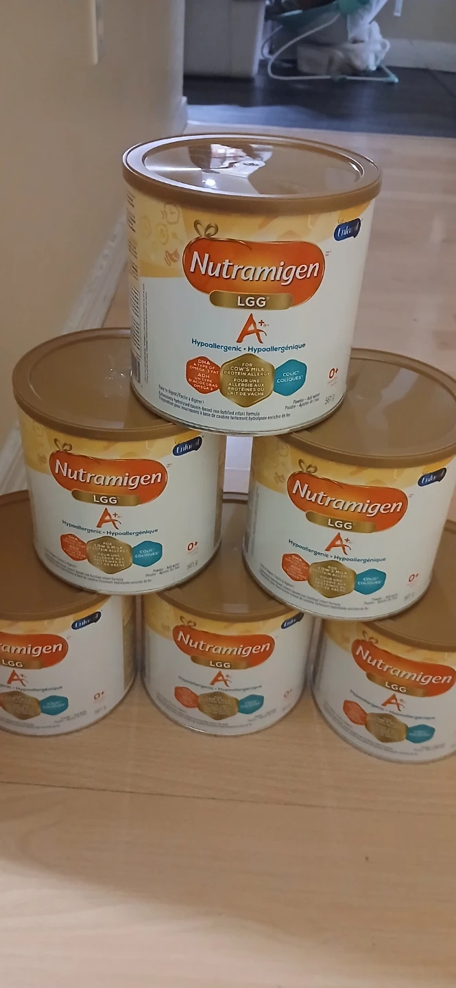 Six cans of Nutramigen LGG A+ hypoallergenic infant formula. It's formulated for cow's milk protein allergy and colic. Each can is 561g.