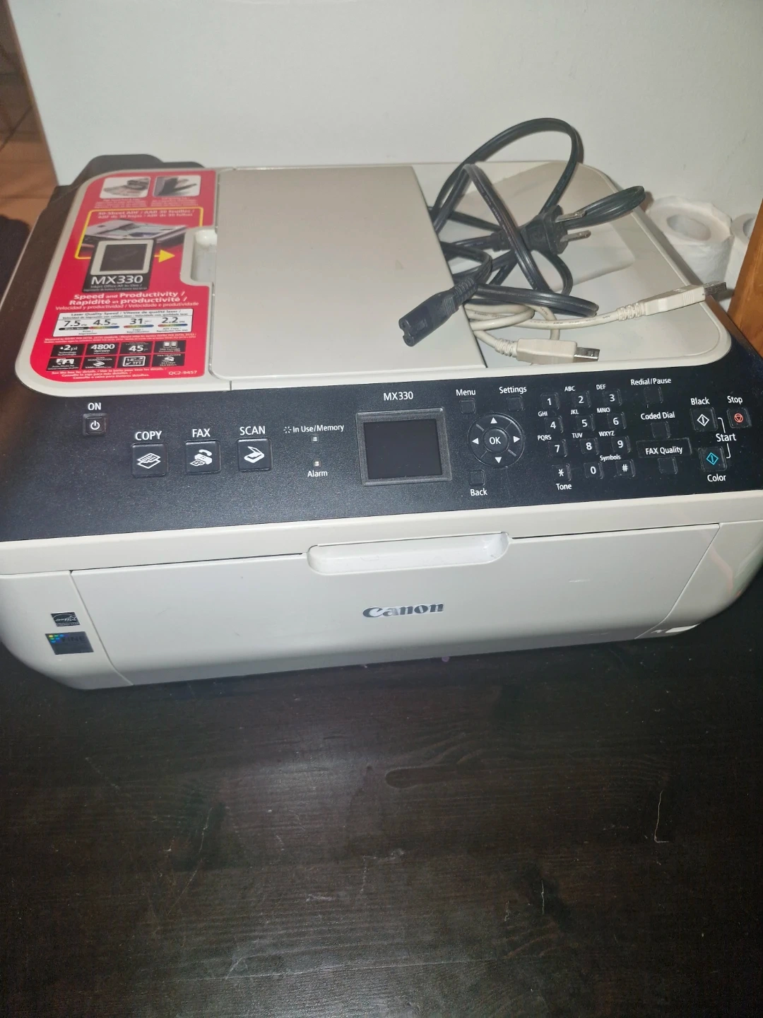 This is a Canon MX330 all-in-one printer that can copy, fax, scan, and print. It supports up to 4800 dpi print resolution. It's a versatile machine for home or office use.