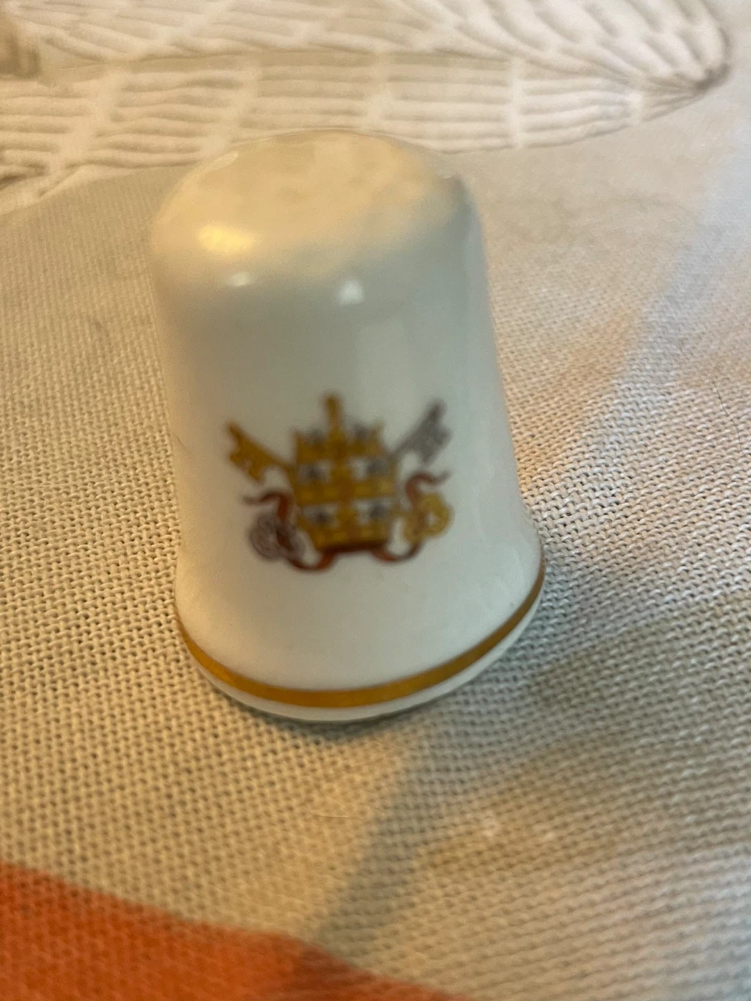 This thimble features a portrait of Pope John Paul II and the papal crest. It's crafted from fine bone china. Made in England.