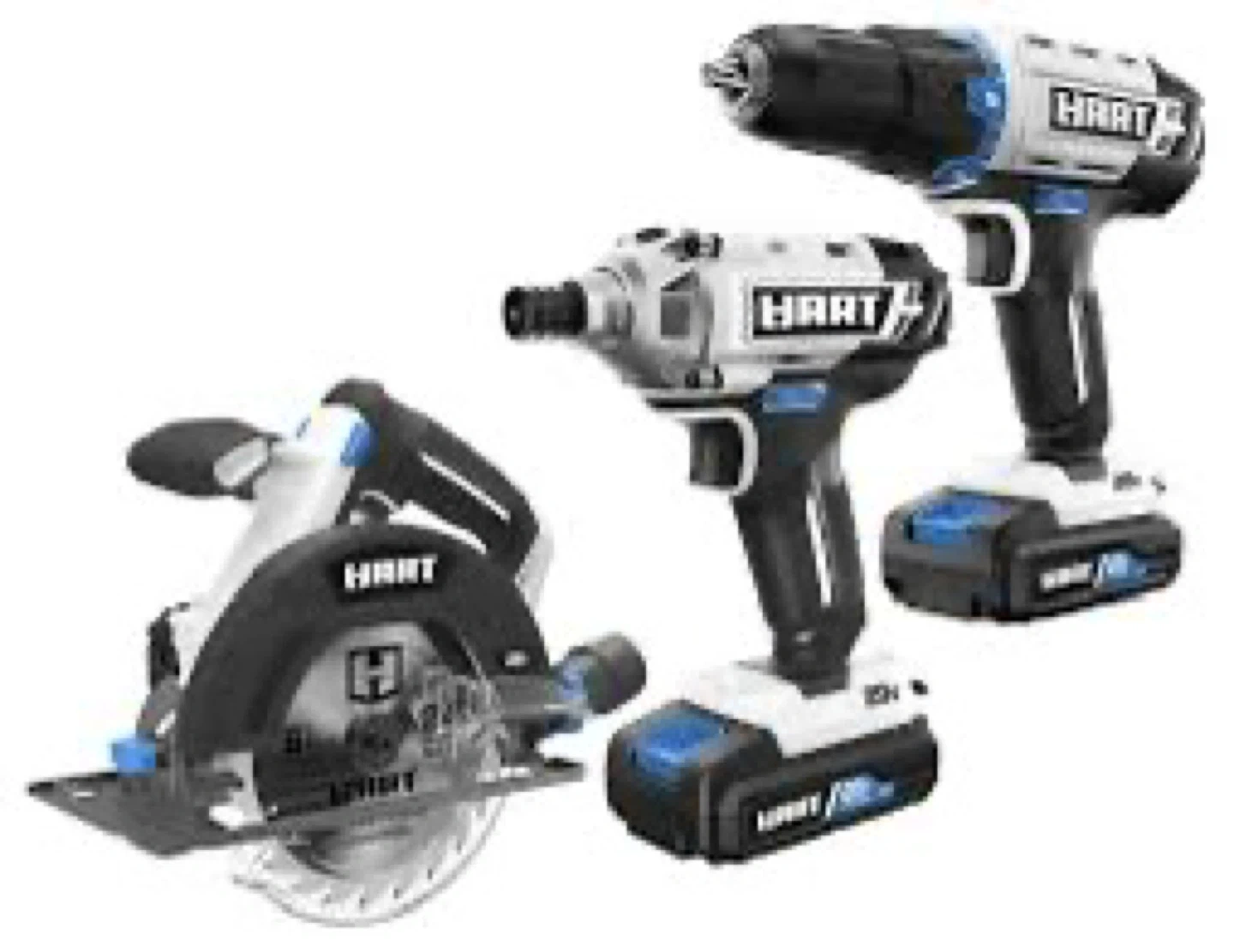 Get a HART 20V 3-tool combo kit! It includes a cordless drill, impact driver, and circular saw. Batteries and charger are included for this power system.