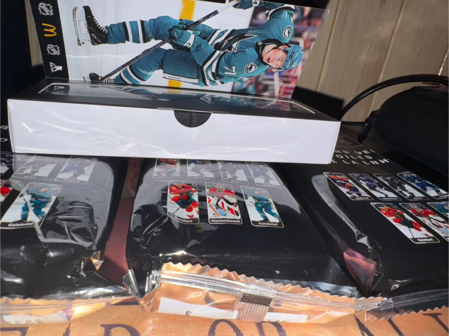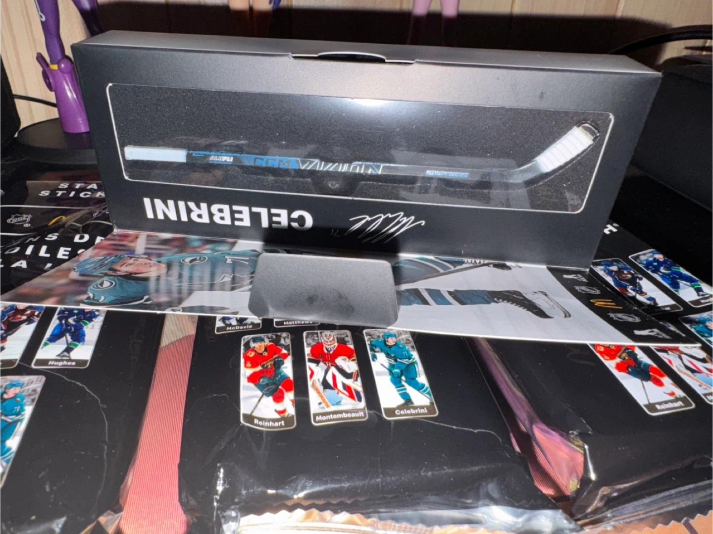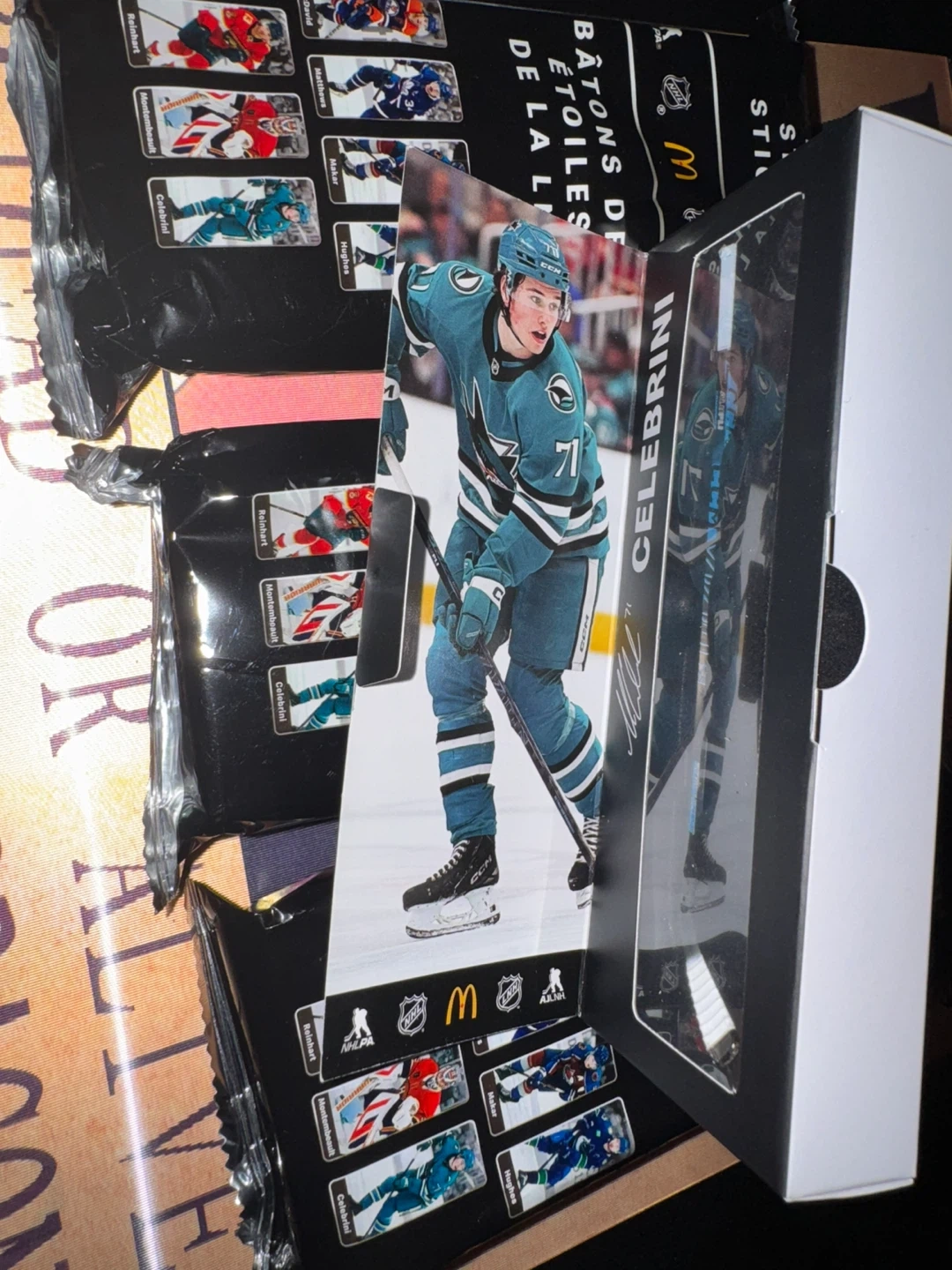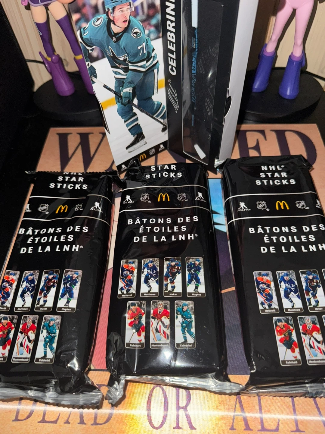 CELEBRINI AND Three unopened packs of McDonald's NHL Star Sticks. Includes a collectible miniature hockey stick in a display box. Cards feature NHL players.