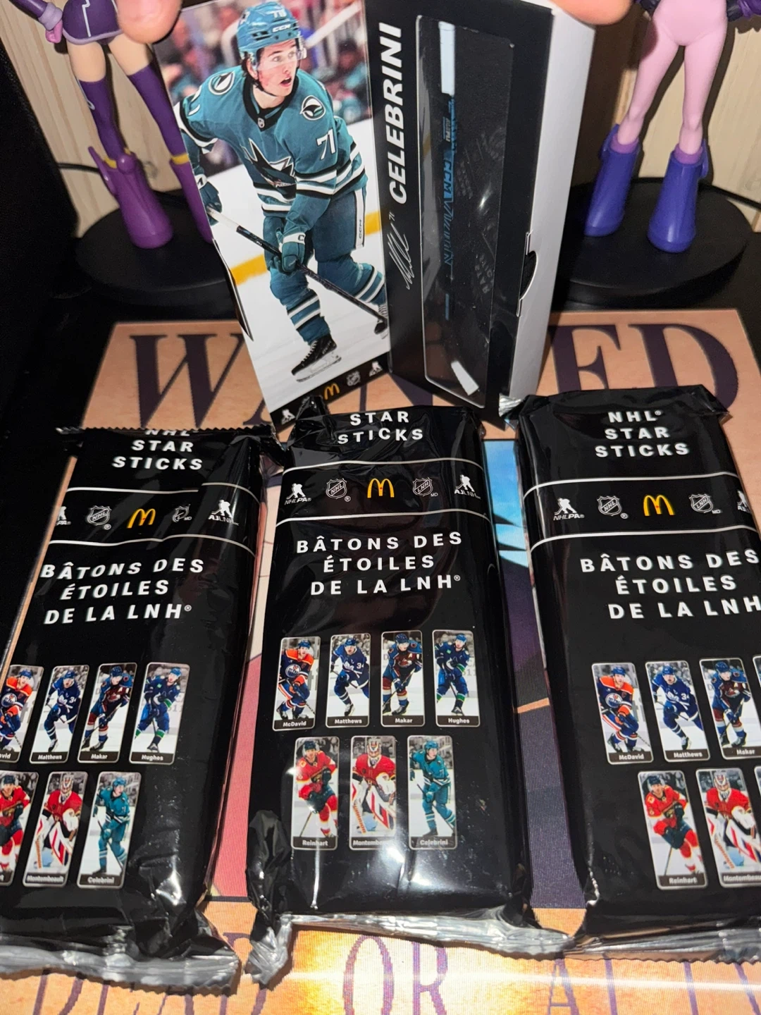 CELEBRINI AND Three unopened packs of McDonald's NHL Star Sticks. Includes a collectible miniature hockey stick in a display box. Cards feature NHL players.