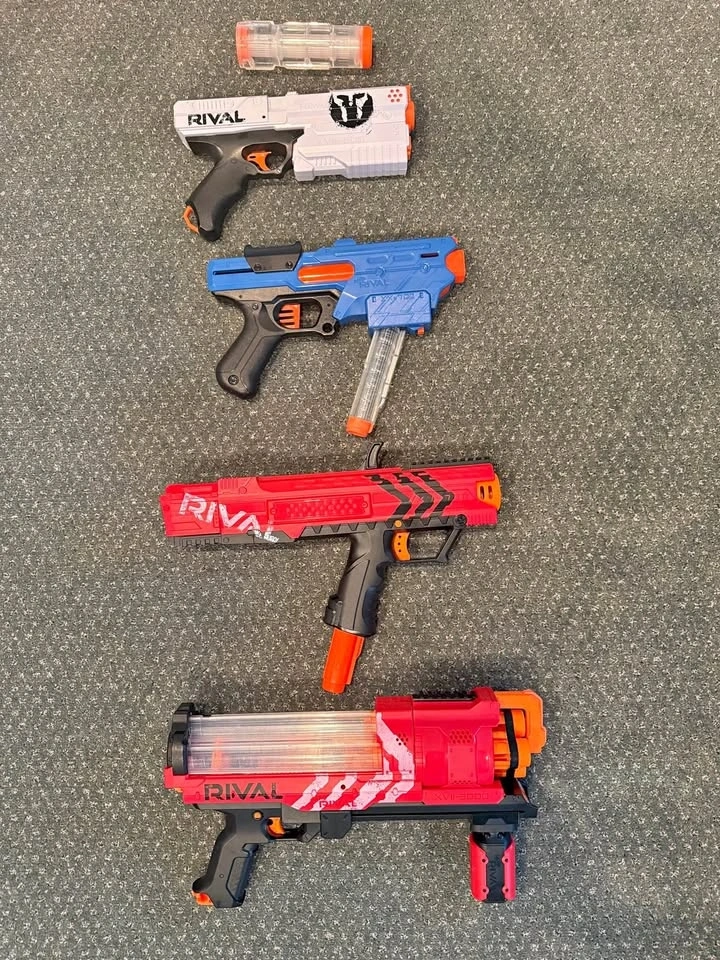4 Rival Nerf Guns! No darts included. Bottom gun holds 70 darts! Lots of fun! We are spring cleaning! Check out our other listings! Porch PU in Dundas near SWO.