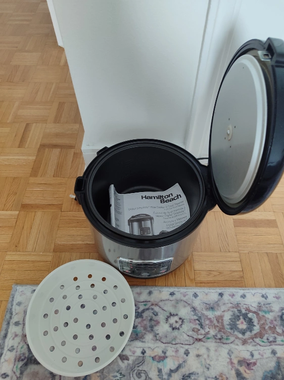 This Hamilton Beach rice cooker and steamer is perfect for cooking rice and steaming vegetables simultaneously, featuring a nonstick pot and a capacity for up to 20 cups of cooked rice. This item has been used, but remains in good working condition, ready to assist with quick and easy meal preparation.