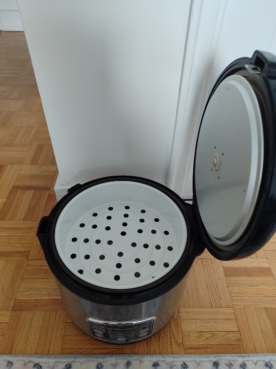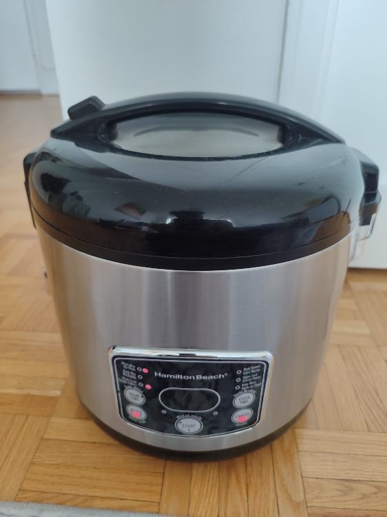 This Hamilton Beach rice cooker and steamer is perfect for cooking rice and steaming vegetables simultaneously, featuring a nonstick pot and a capacity for up to 20 cups of cooked rice. This item has been used, but remains in good working condition, ready to assist with quick and easy meal preparation.