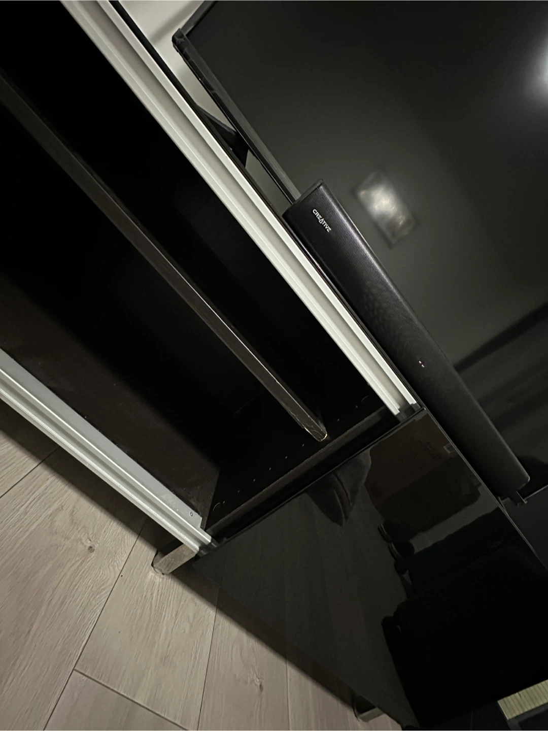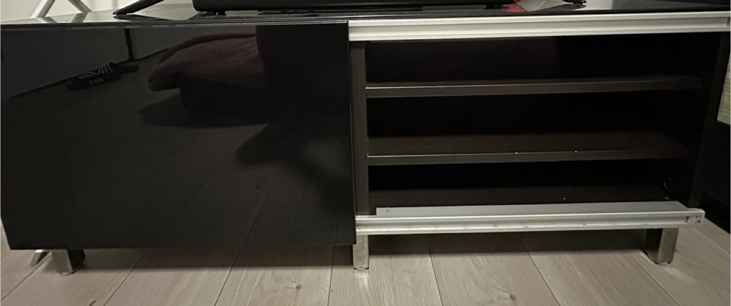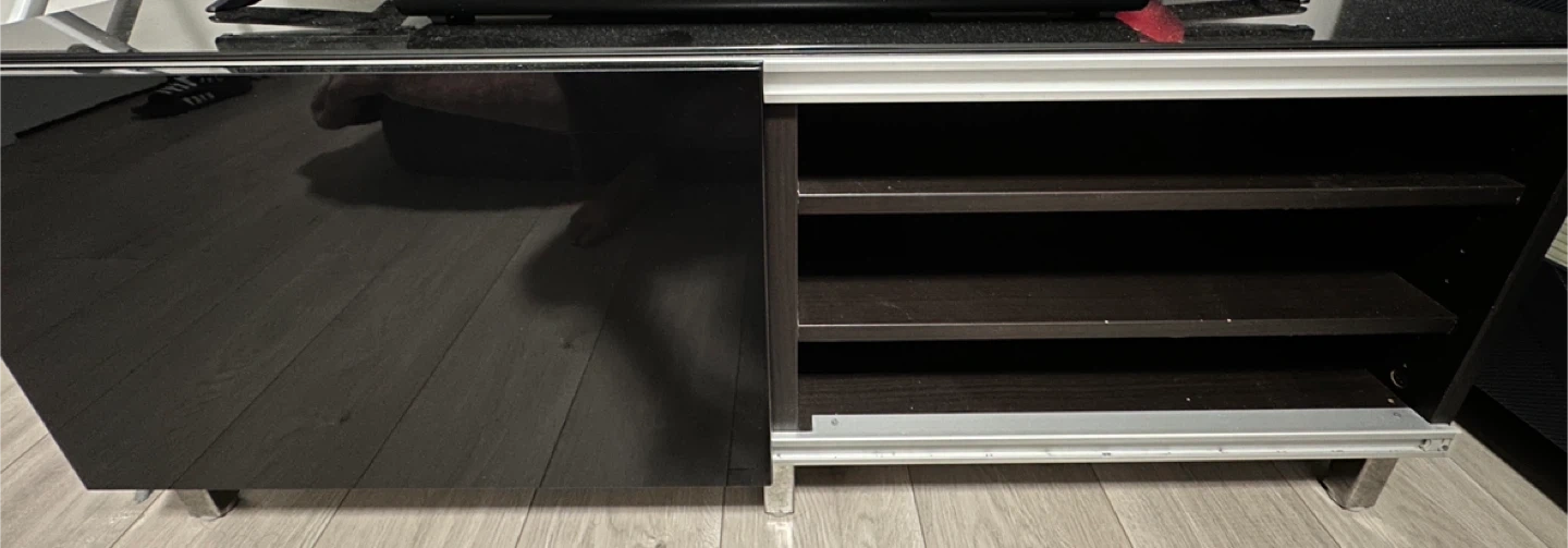 Selling a sleek black TV stand with convenient shelving! It's in great shape and ready to hold your television upto 55 inch and media components. The stand features a sliding door and sturdy construction.