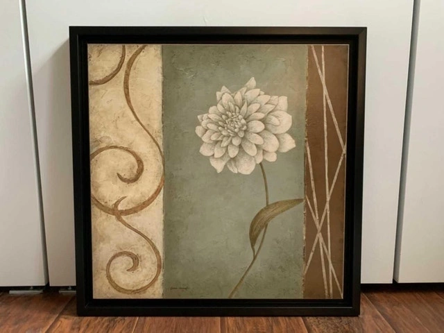 Lovely dark bronze frame, raised middle panel with colourful flowers art (no glass). Smoke and pet free home. Excellent condition, heavy 22” square. Pretty black frame, raised middle panel with flower art (no glass). Excellent condition, heavy 22 1/4” square approx. Purchase both and save! Pick up in Keswick. Used for staging. Or Best Offer.