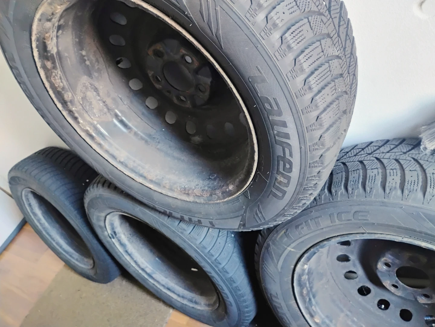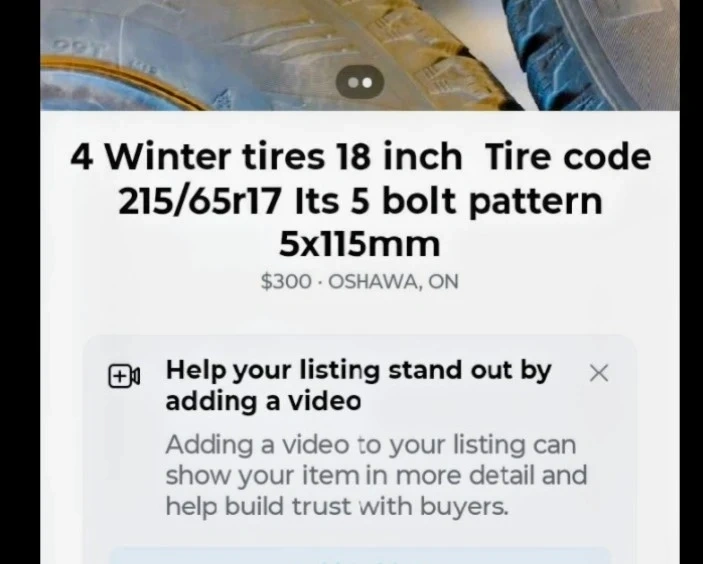 Four winter tires, 18 inch size with a 215/65R17 tire code. They have a 5 bolt pattern measuring 5x115mm. These tires are ideal for winter driving conditions.