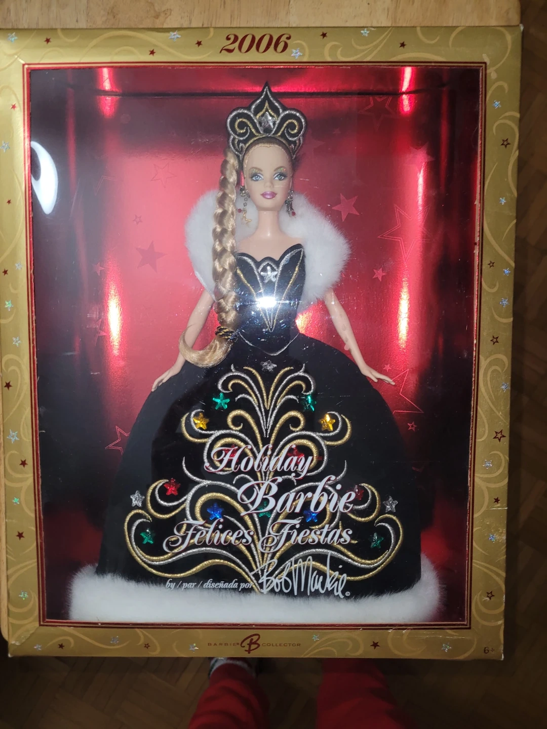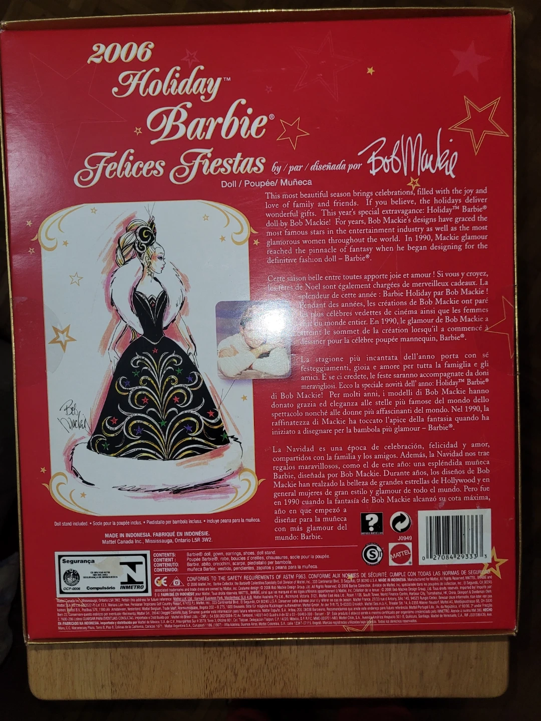 This is the 2006 Holiday Barbie "Felices Fiestas" by Bob Mackie. It's a beautiful special edition doll celebrating the joy of the season. Designed by Bob Mackie, it features a stunning gown inspired by famous stars. Includes doll stand and shoes. Brand new in box.