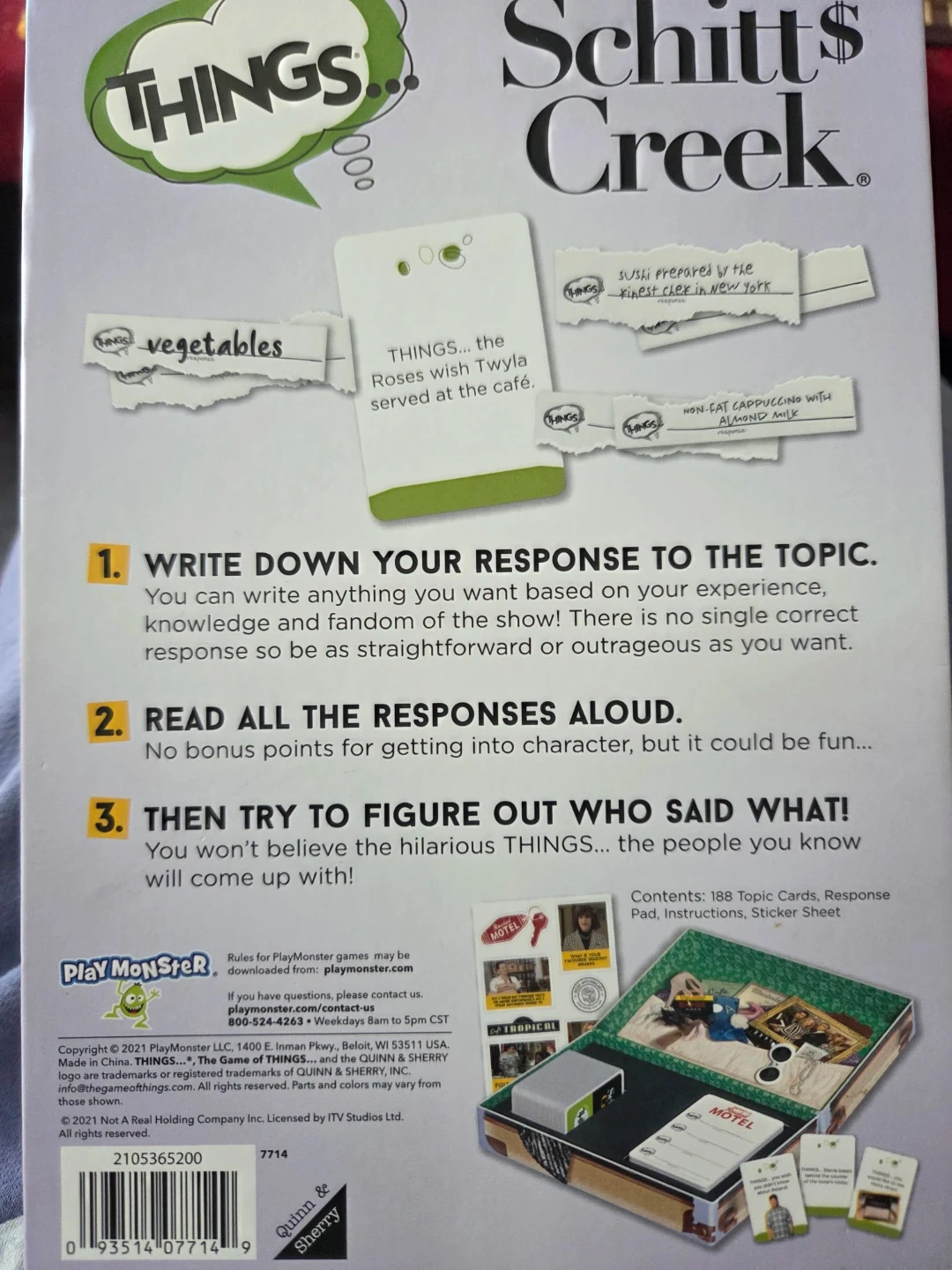 This is the Schitt's Creek Edition of the popular card game, Things!. It includes 188 Topic Cards, Response Pads, Instructions, and Sticker Sheet. It's a fun game for fans of the show.