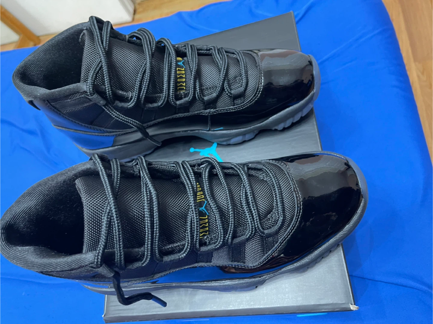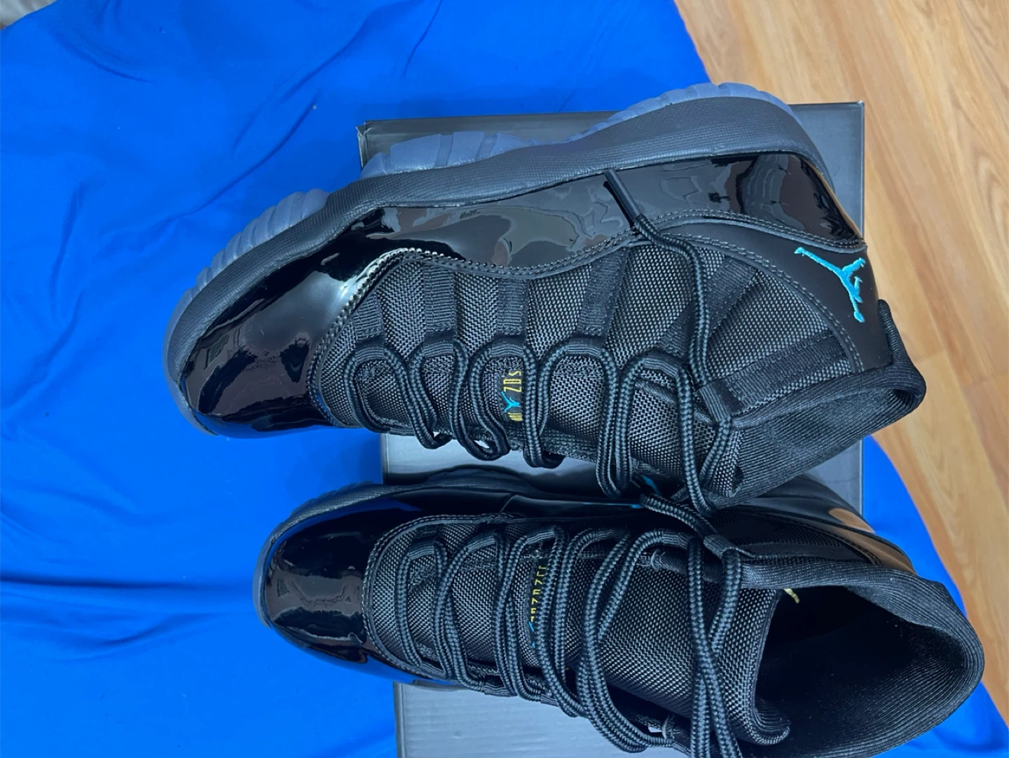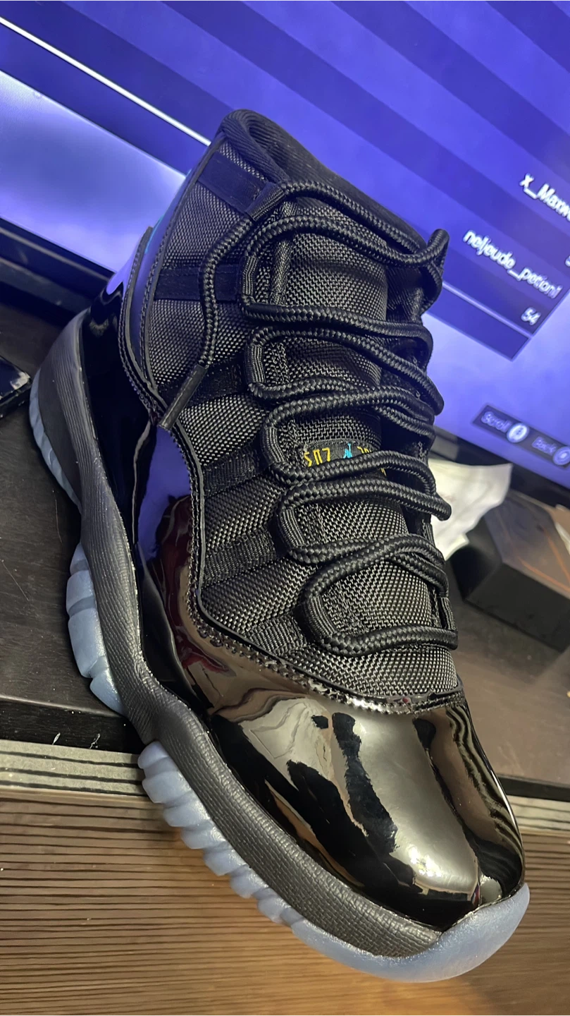 Black patent leather and mesh high-top sneakers with bright blue accents. Features the iconic Jumpman logo and Jordan 11 branding. Includes original box.
