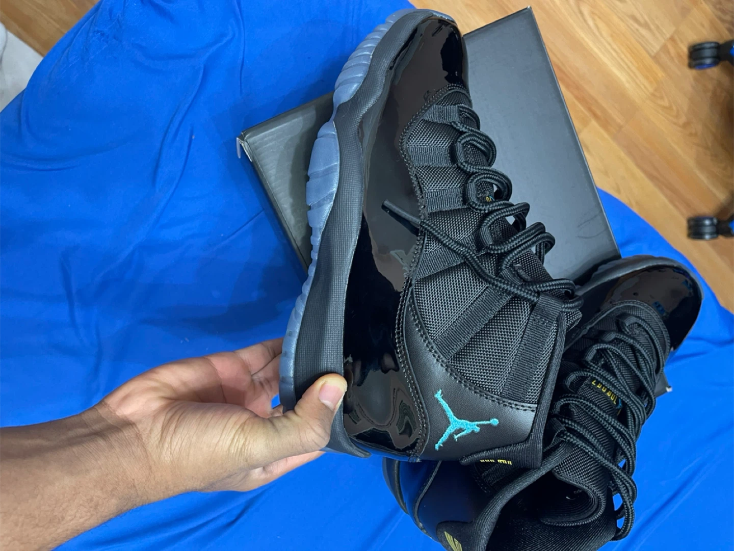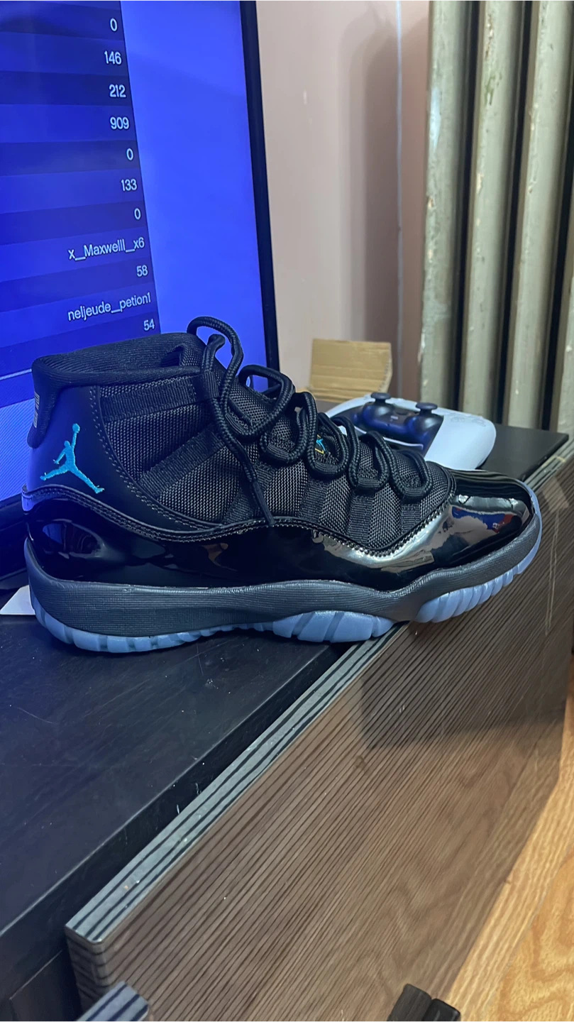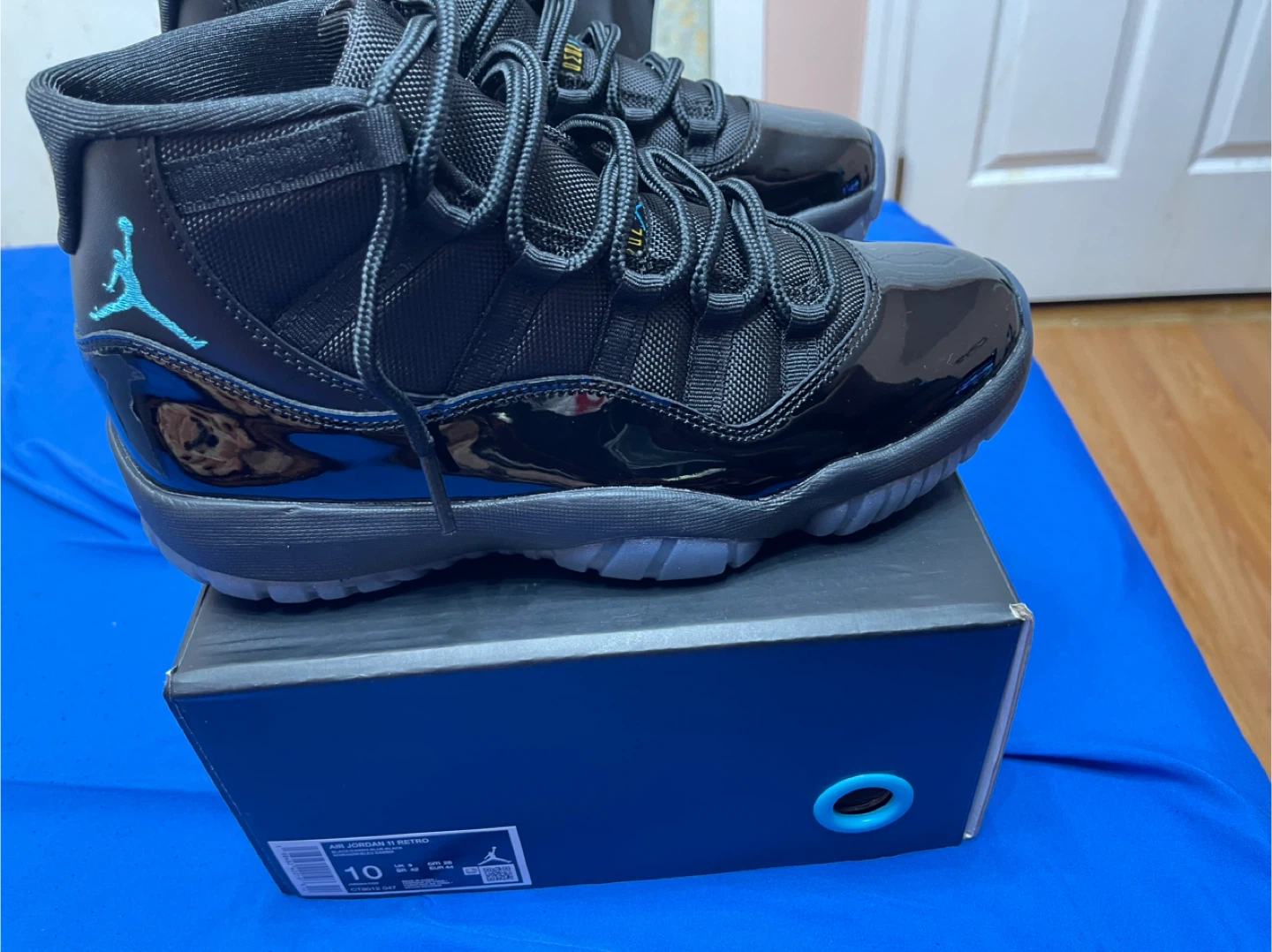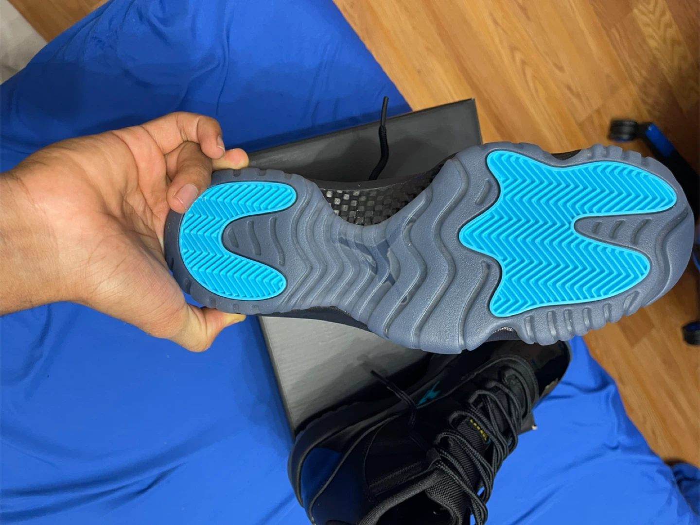 Black patent leather and mesh high-top sneakers with bright blue accents. Features the iconic Jumpman logo and Jordan 11 branding. Includes original box.