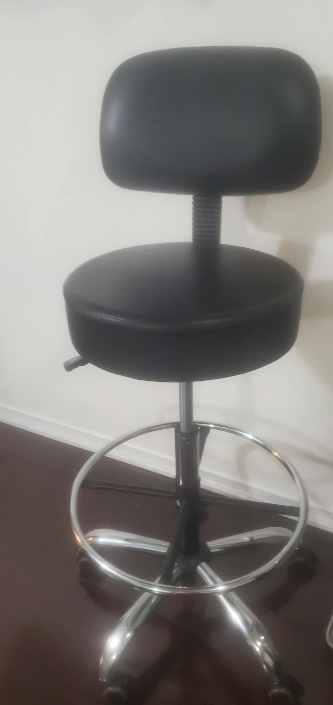 Adjustable black stool with a backrest and foot ring. It's made of faux leather and metal. This chair is great for workshops or as a drafting stool.