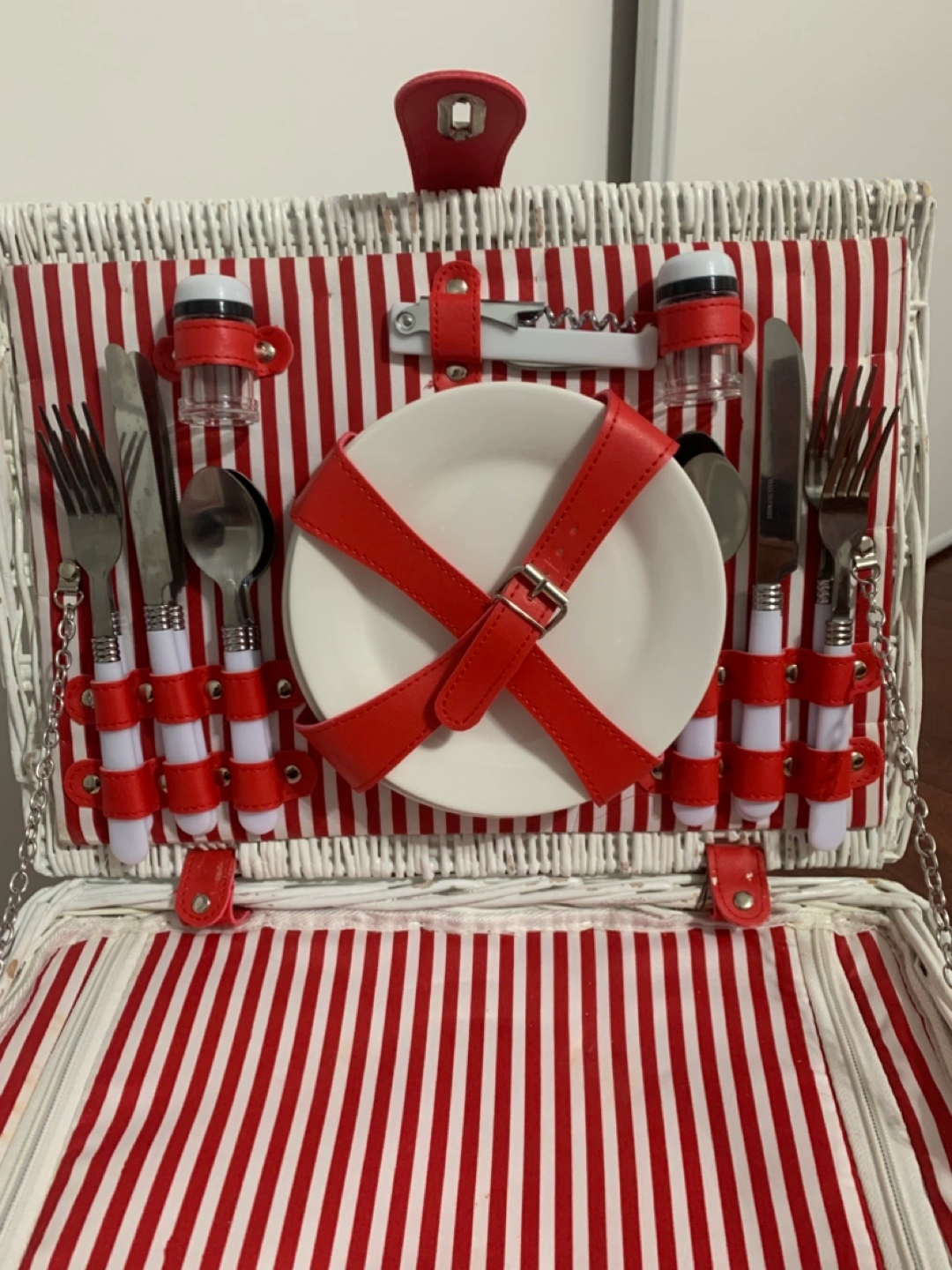 This classic white wicker picnic basket features a charming red and white striped interior lining. It includes a set of cutlery, plates, and cups, perfect for outdoor meals. The insulated compartment helps keep your food fresh. Also comes with a picnic blanket. A great way to enjoy a meal outdoors!