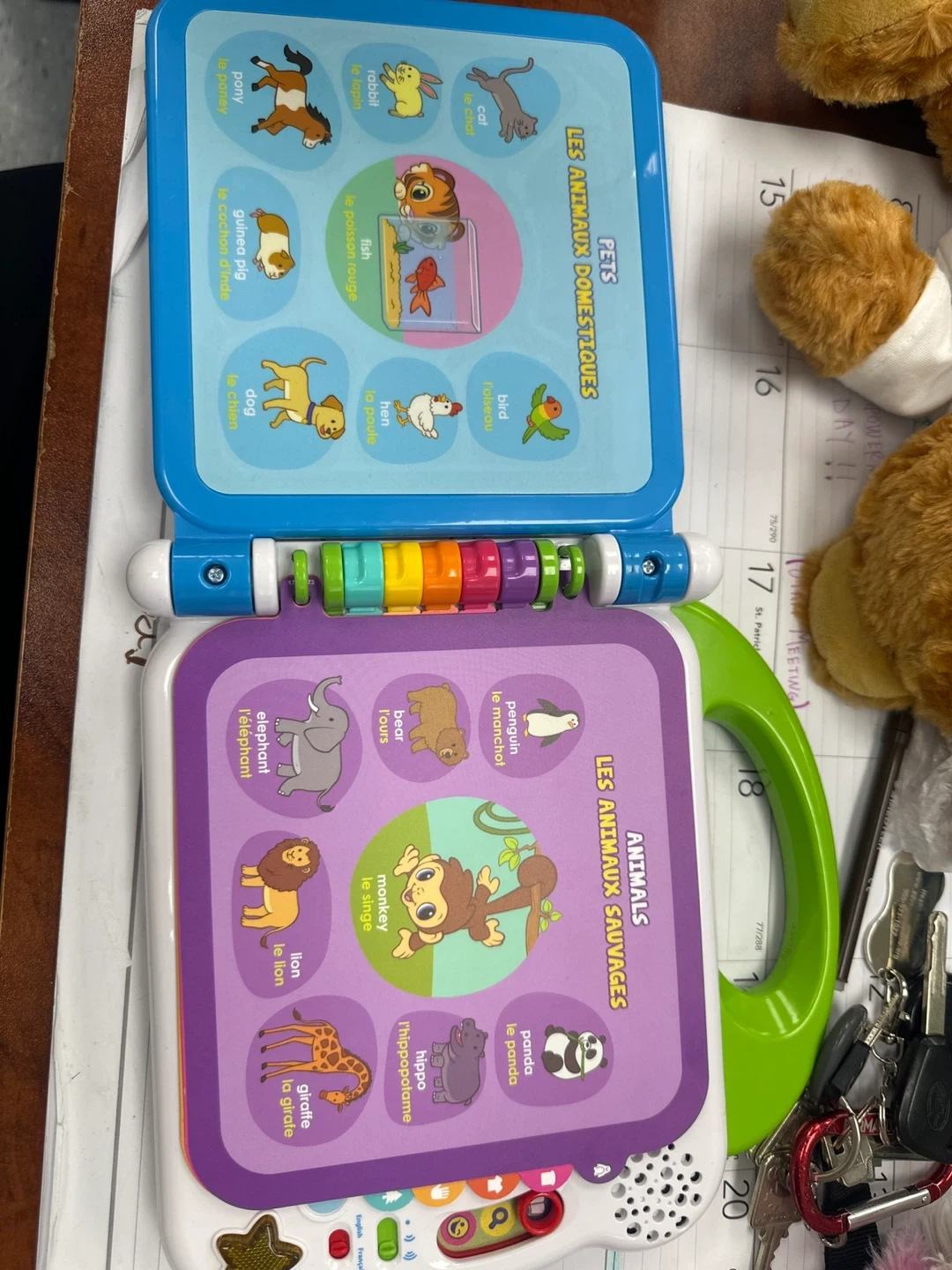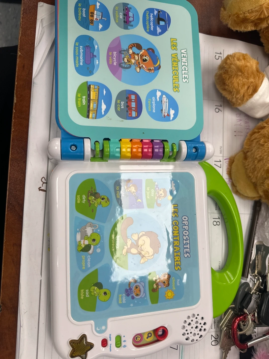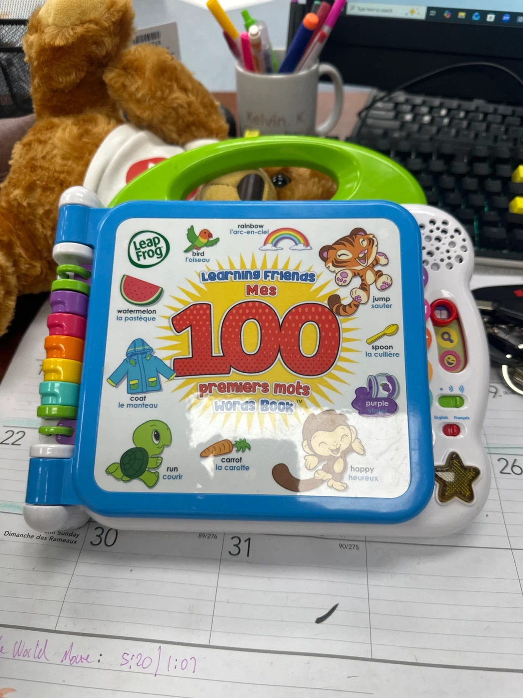 This LeapFrog Learning Friends 100 Words Book is designed for young learners. It features various topics like colours, animals, and vehicles. It's bilingual, offering content in English and French for expanded learning. This interactive book helps introduce new vocabulary in a fun way!