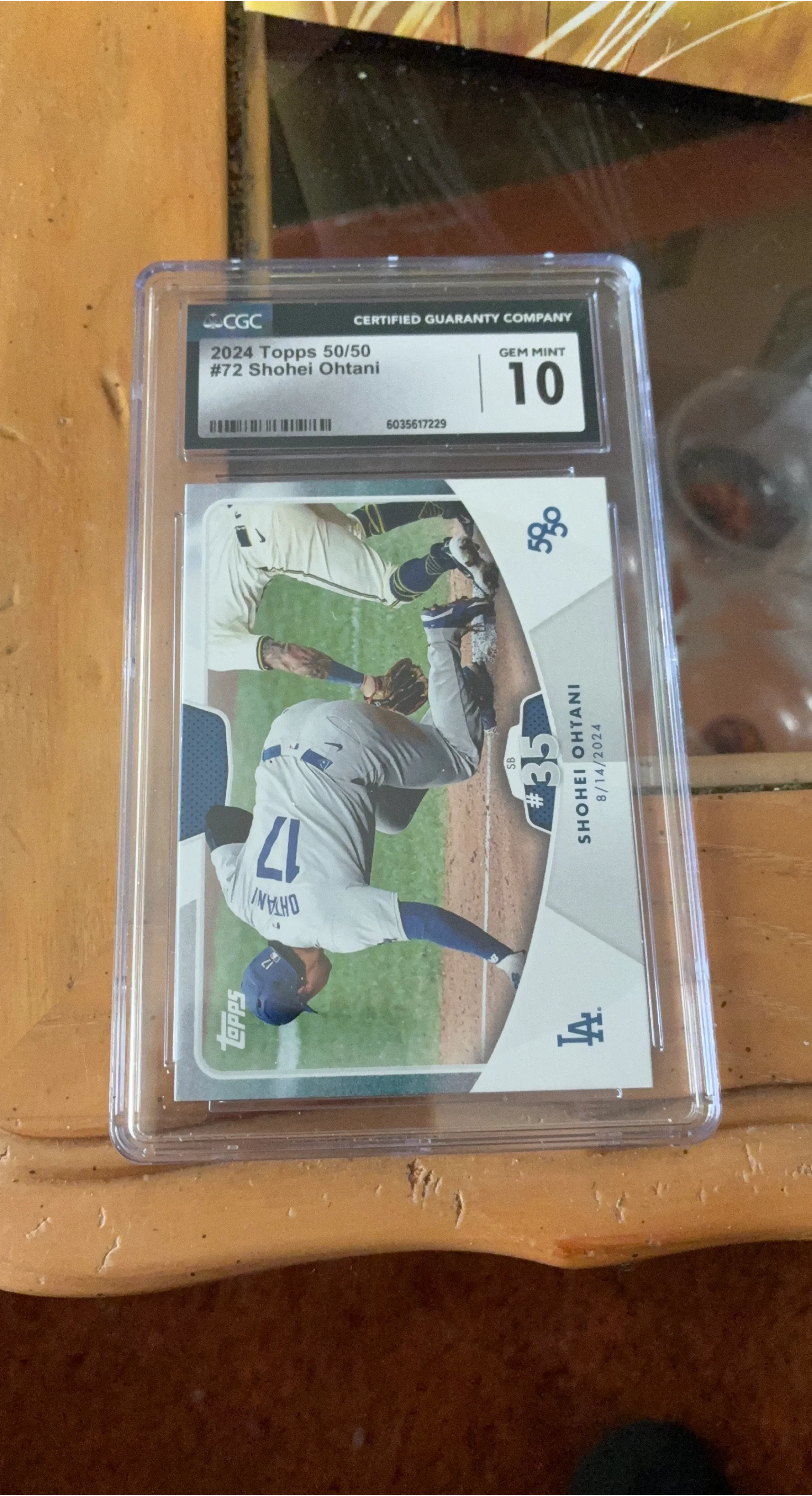This is a 2024 Topps 50/50 #72 Shohei Ohtani baseball card. It's graded Gem Mint 10 by CGC. The card features Shohei Ohtani in his Los Angeles Dodgers uniform. It has a manufacturing date of August 14, 2024.