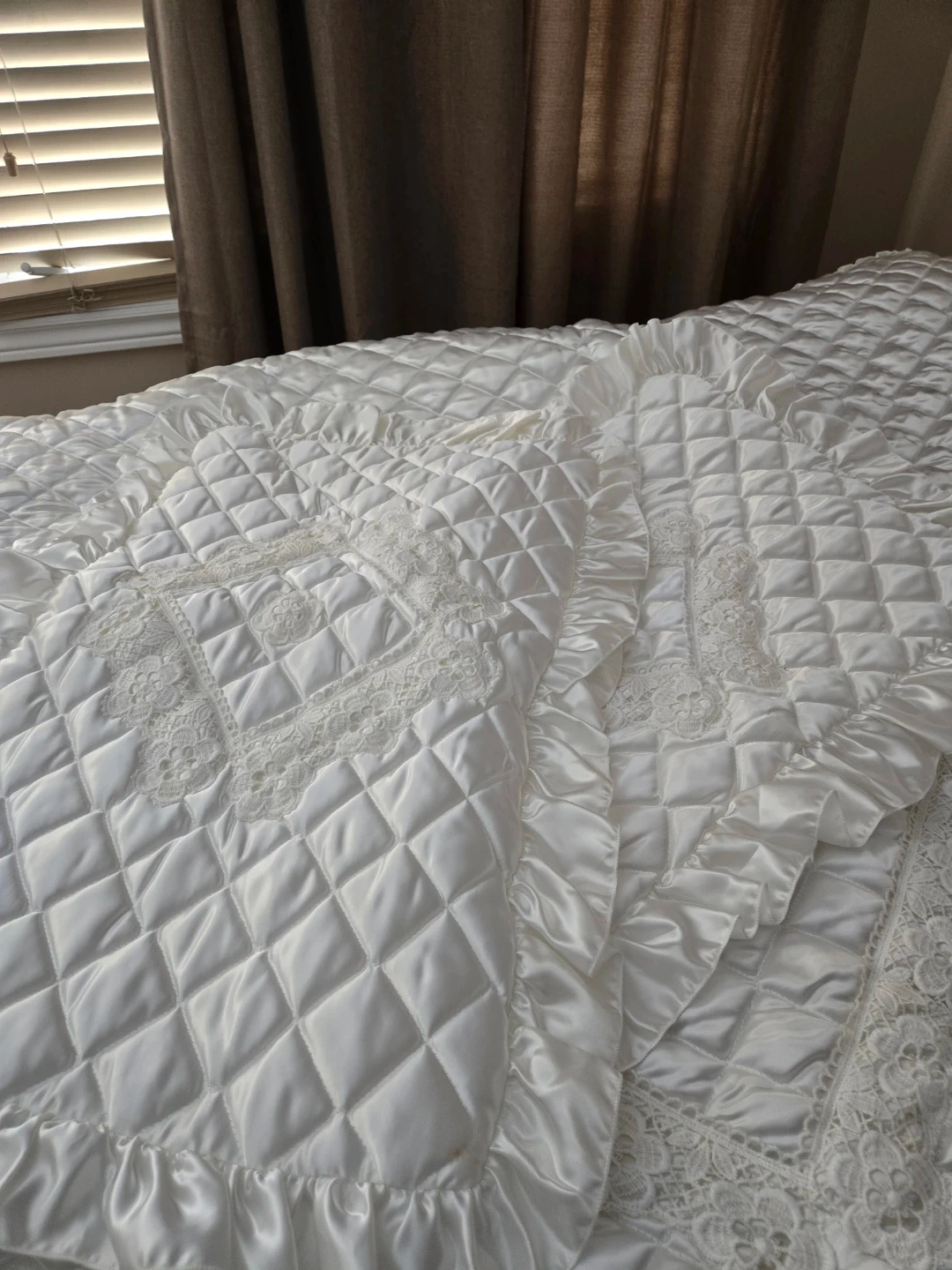 Beautiful white satin bedspread with diamond quilting and delicate lace trim. Features a ruffled edge and a decorative lace panel in the centre. plus 2 x pillow shams. It's perfect for adding a touch of elegance to any bedroom!