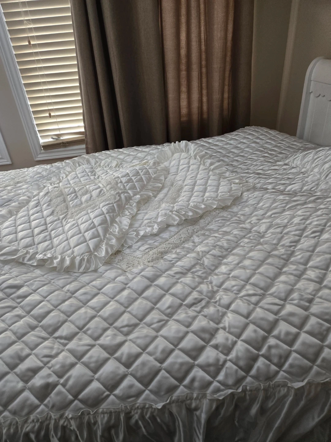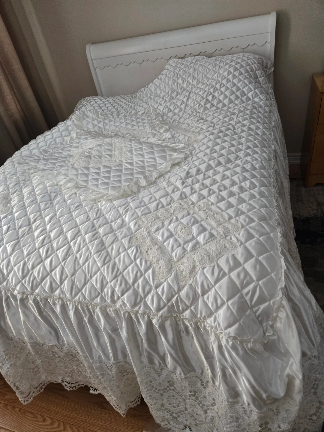 Beautiful white satin bedspread with diamond quilting and delicate lace trim. Features a ruffled edge and a decorative lace panel in the centre. plus 2 x pillow shams. It's perfect for adding a touch of elegance to any bedroom!