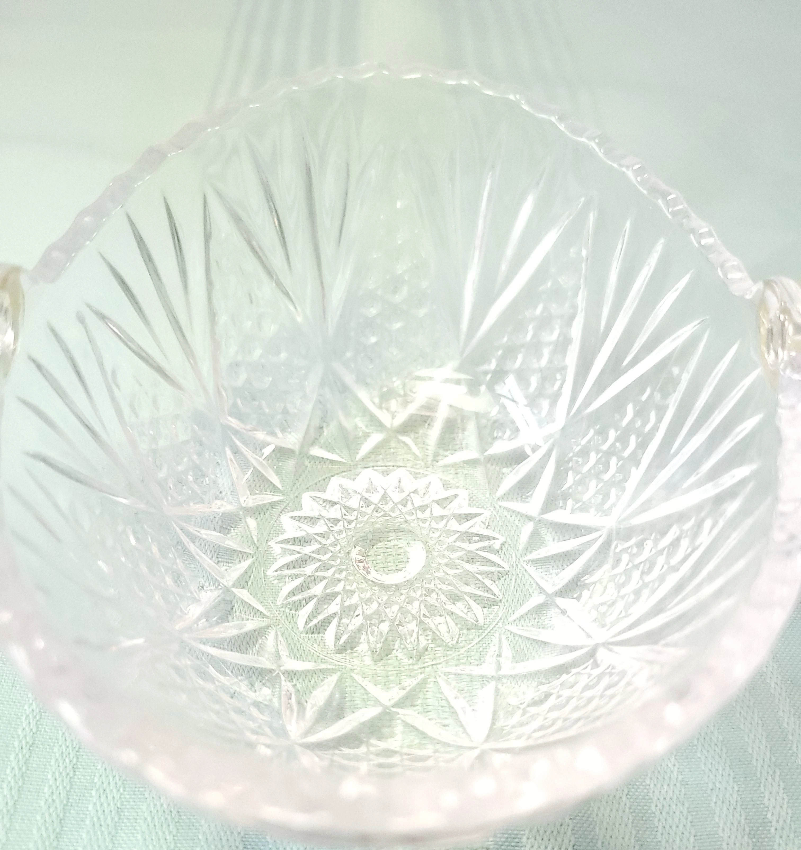 This is an exceptional 1982 centerpiece basket crafted from heavy, high-clarity 24% lead crystal (Bleikristall), manufactured in West Germany. The design features intricate, deep-cut starburst and diamond patterns that provide brilliant light refraction. It is finished with its original gold-toned twisted metal handle, a characteristic feature of premium German giftware from this era.