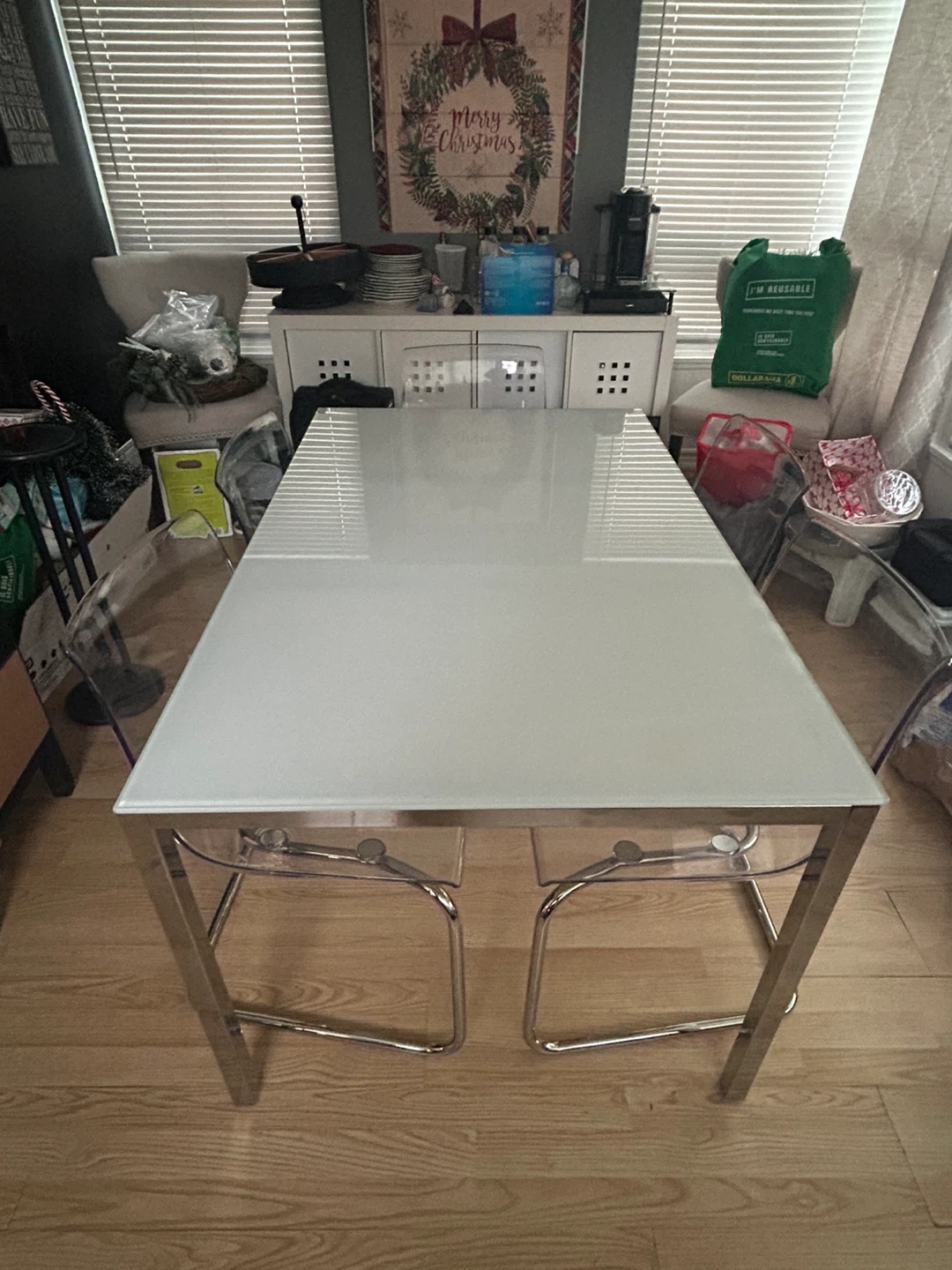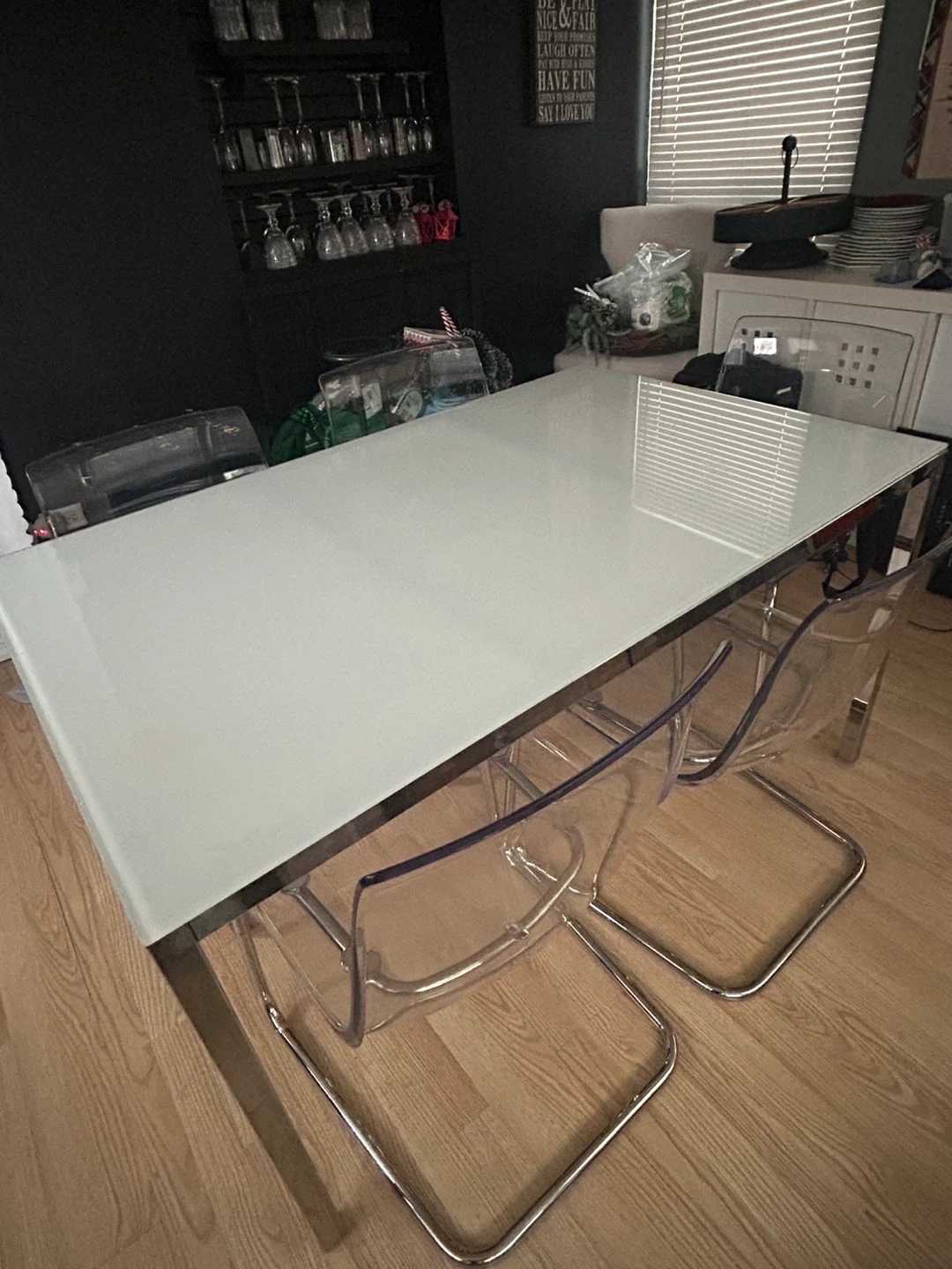 A sleek white glass dining table with sturdy chrome legs. It's perfect for smaller dining spaces or as a chic accent table. The smooth glass surface is easy to wipe clean. A great spot for meals or casual gatherings!