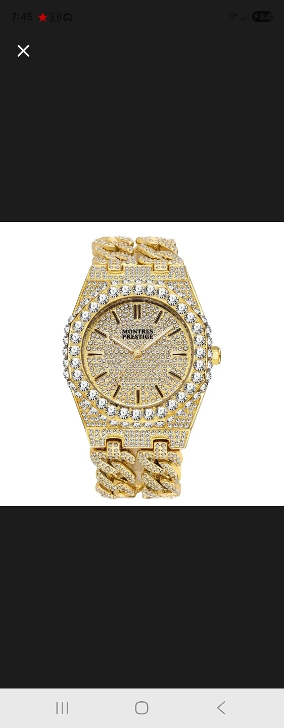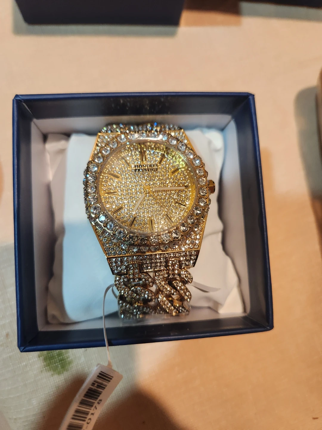 This is a Montres Prestige watch with a diamond-accented face and band. It's gold-toned and comes in its original box. This statement piece adds a lot of sparkle!