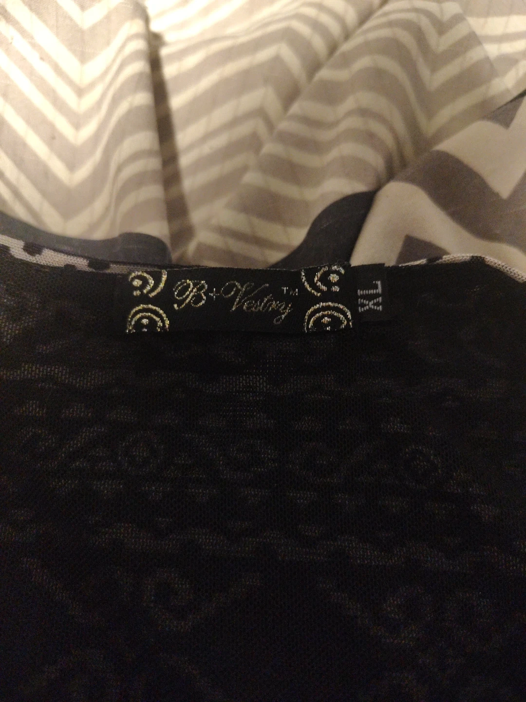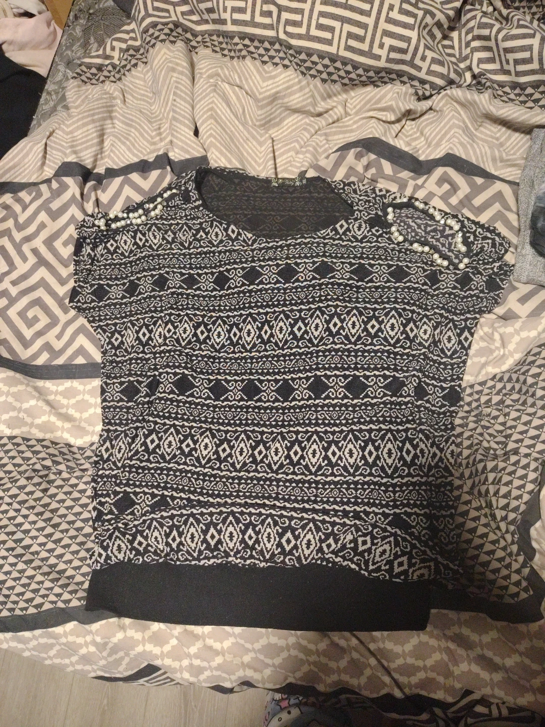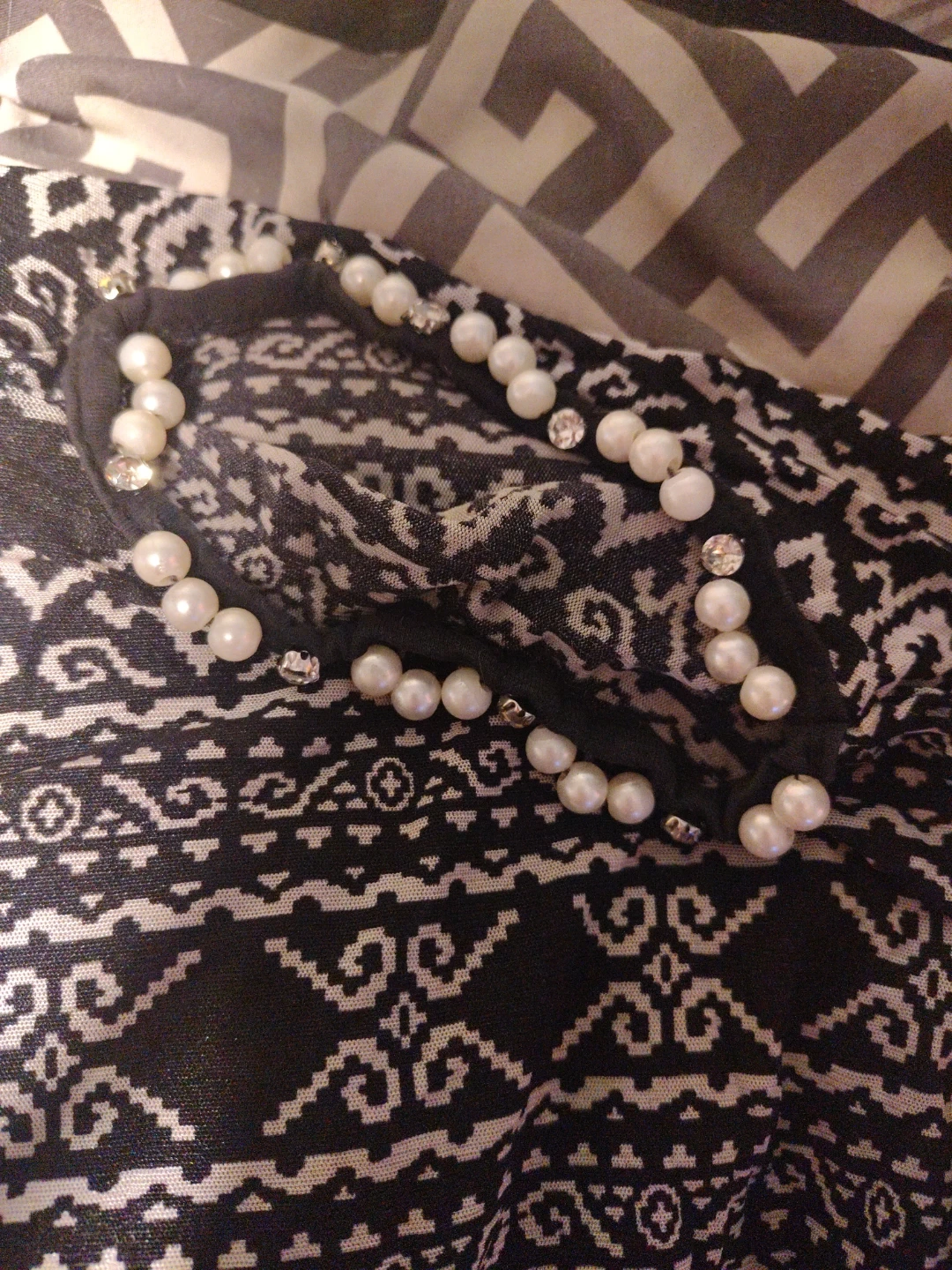 This B+ Vestry top comes in a black and white geometric pattern. It features pearl and rhinestone embellishments on the shoulders. Size XL.