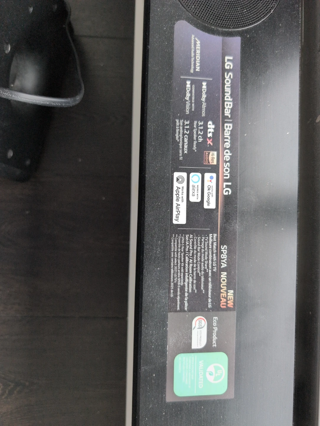 LG Sound Bar SP8YA with Meridian audio technology. Features Dolby Atmos and DTS:X support. Includes a subwoofer for enhanced bass. Compatible with Apple AirPlay and Google Assistant.