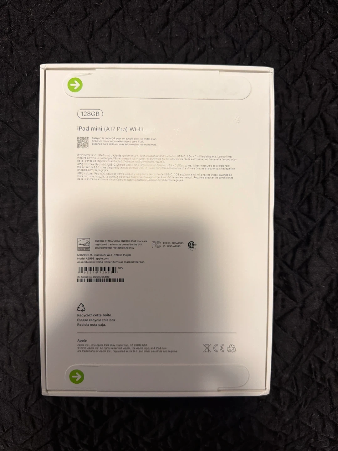 It's an Apple iPad Mini (7th Gen) with Wi-Fi and 128GB storage. This tablet comes in a nice purple colour. It's great for everyday tasks and portability!