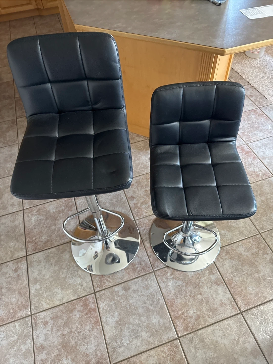 Black bar stools set of 2. Swivel adjustable height. Chrome base and seat trim. Comfortable tufted cushioning. Like new condition.