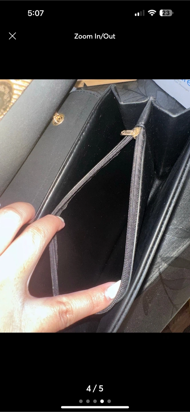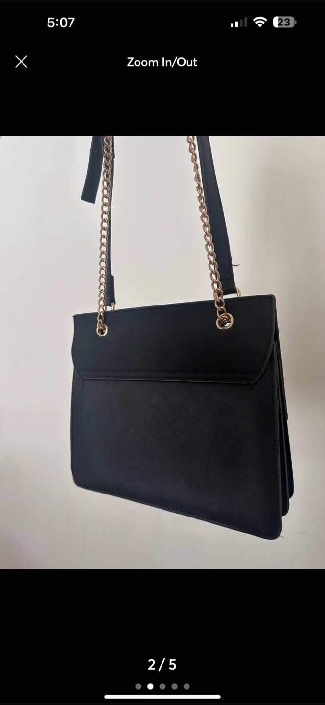 This is a black shoulder bag with a chain strap. It's in great condition and ready for a new home! The bag features a stylish design and a convenient size for carrying your essentials. It has a clasp closure and a zippered interior pocket.