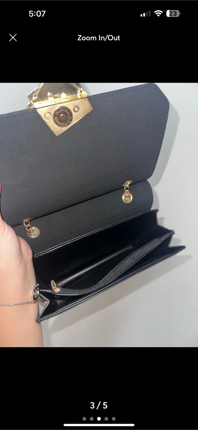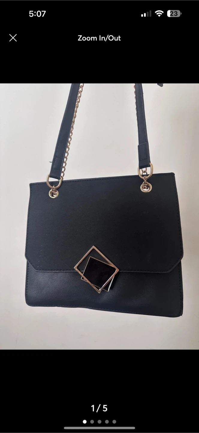 This is a black shoulder bag with a chain strap. It's in great condition and ready for a new home! The bag features a stylish design and a convenient size for carrying your essentials. It has a clasp closure and a zippered interior pocket.