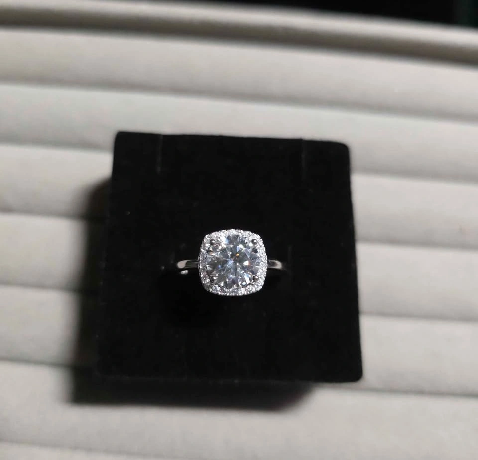 Brand New 2 carat Moissanite Ring (Square halo). D Color | VVS Clarity | Sterling Silver | Hypoallergenic | Adjustable Band | Diamond Tester passed. Sparkles like a diamond — perfect for everyday luxury, bridal gifts, or timeless elegance. Pickup in East Vancouver.