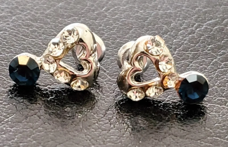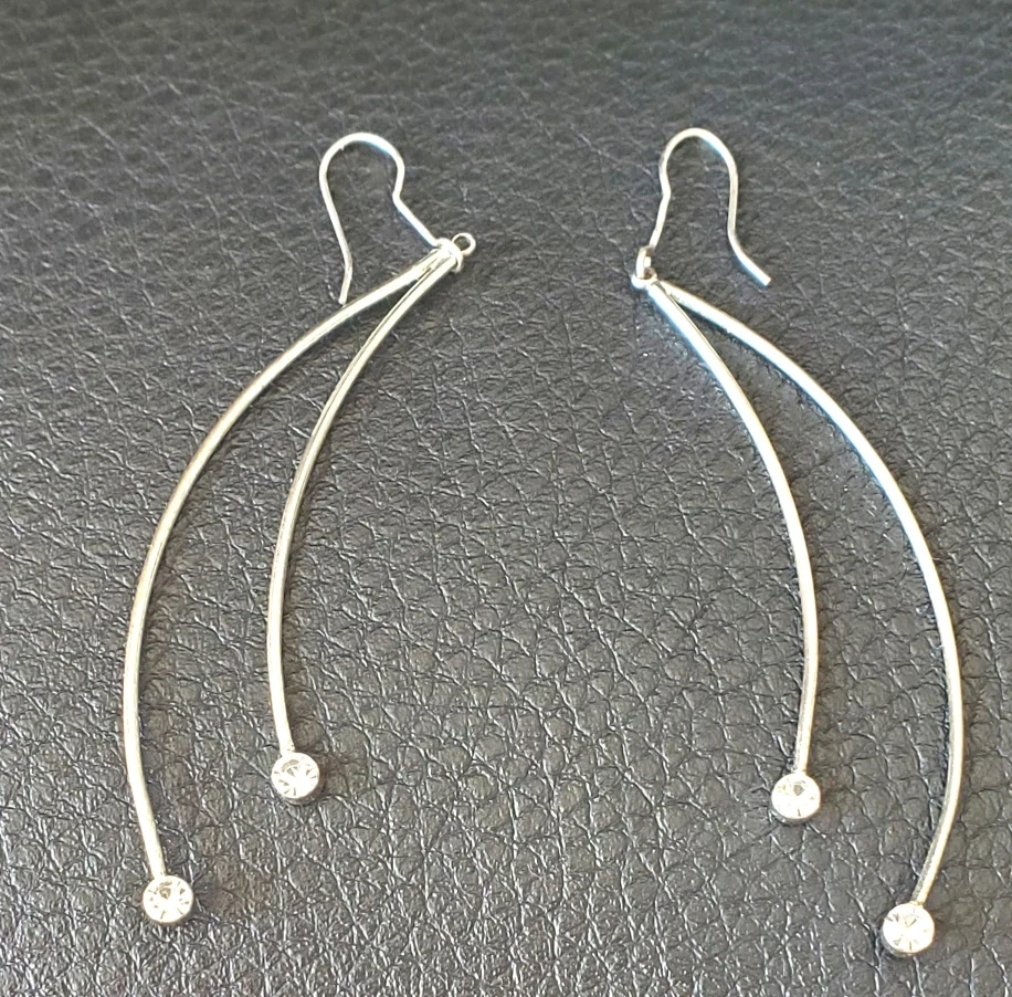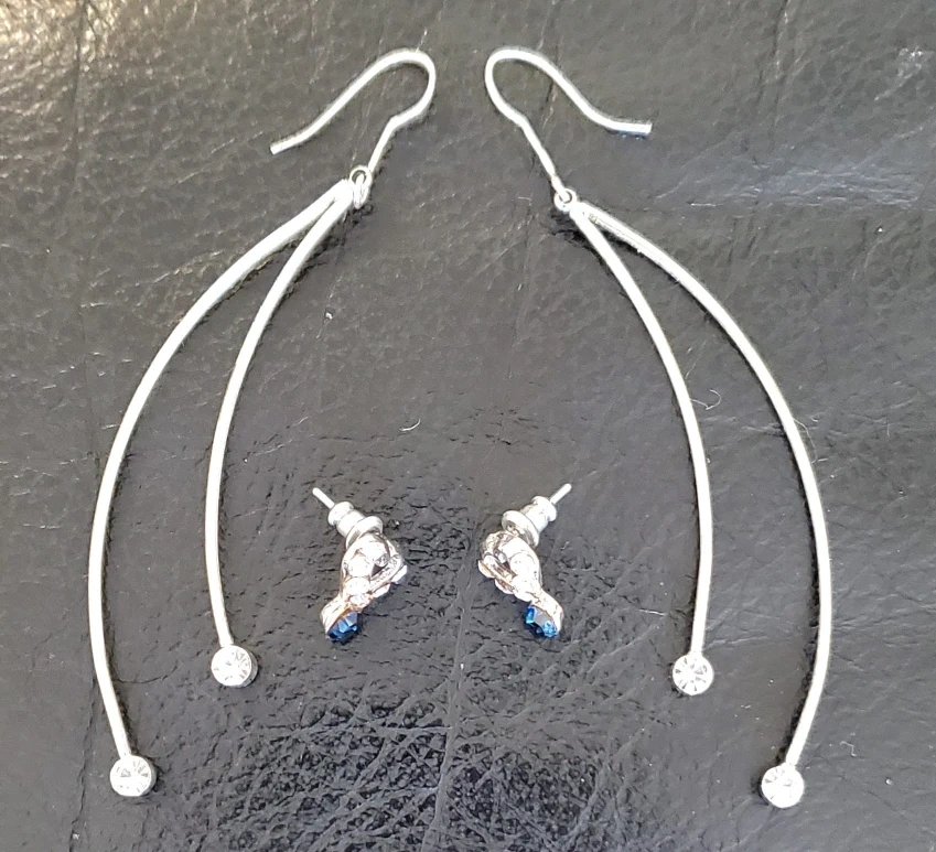 Two pairs of earrings for sale! One pair is a silver tone with a curved design and small rhinestones. The other pair are studs with a dark blue stone and rhinestones