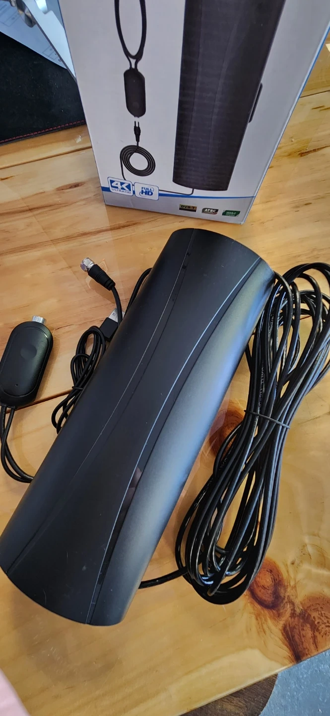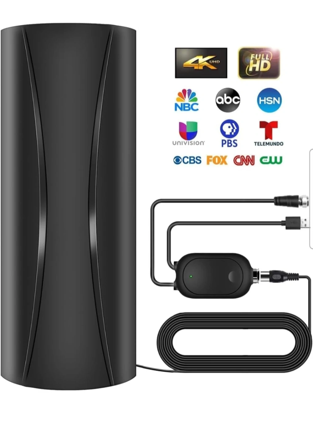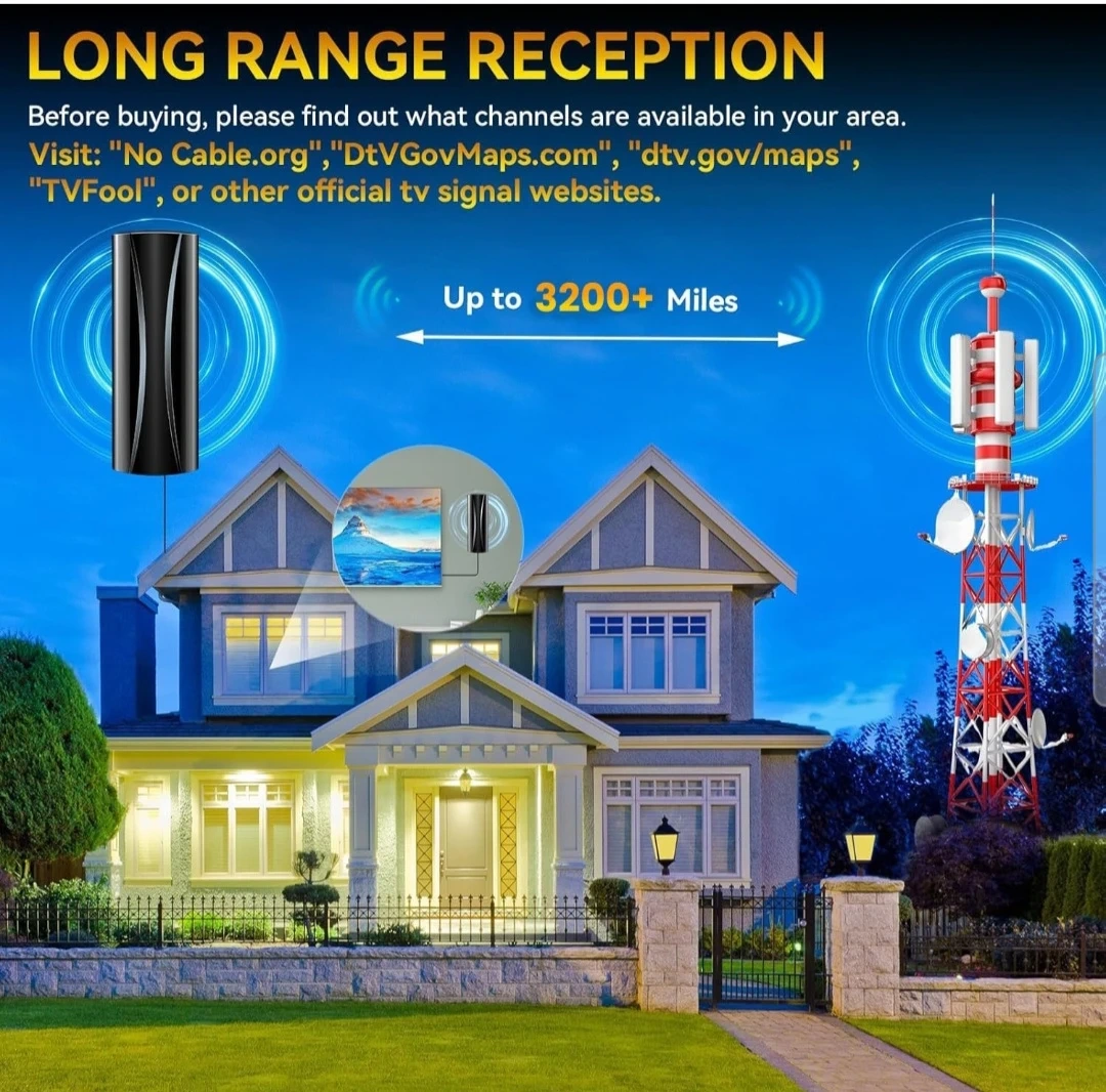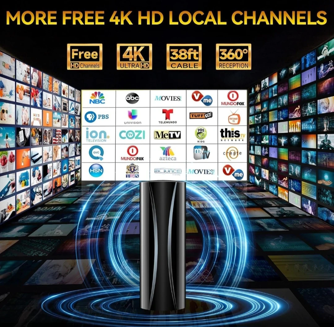 This is a digital HDTV antenna that supports 4K Ultra HD and Full HD. It's suitable for indoor or outdoor use and can be mounted on a table or wall. It provides freeview channels.