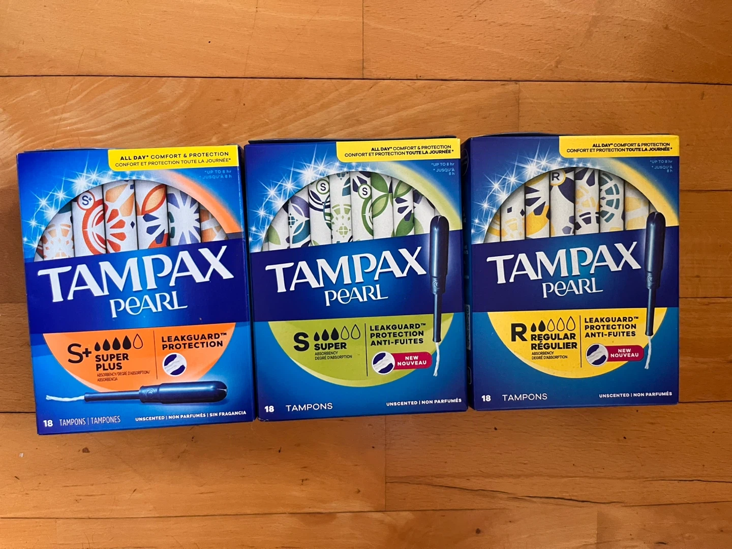 A variety pack of Tampax Pearl tampons. Includes Super Plus, Super, and Regular absorbencies. All are unscented and offer LeakGuard Protection.