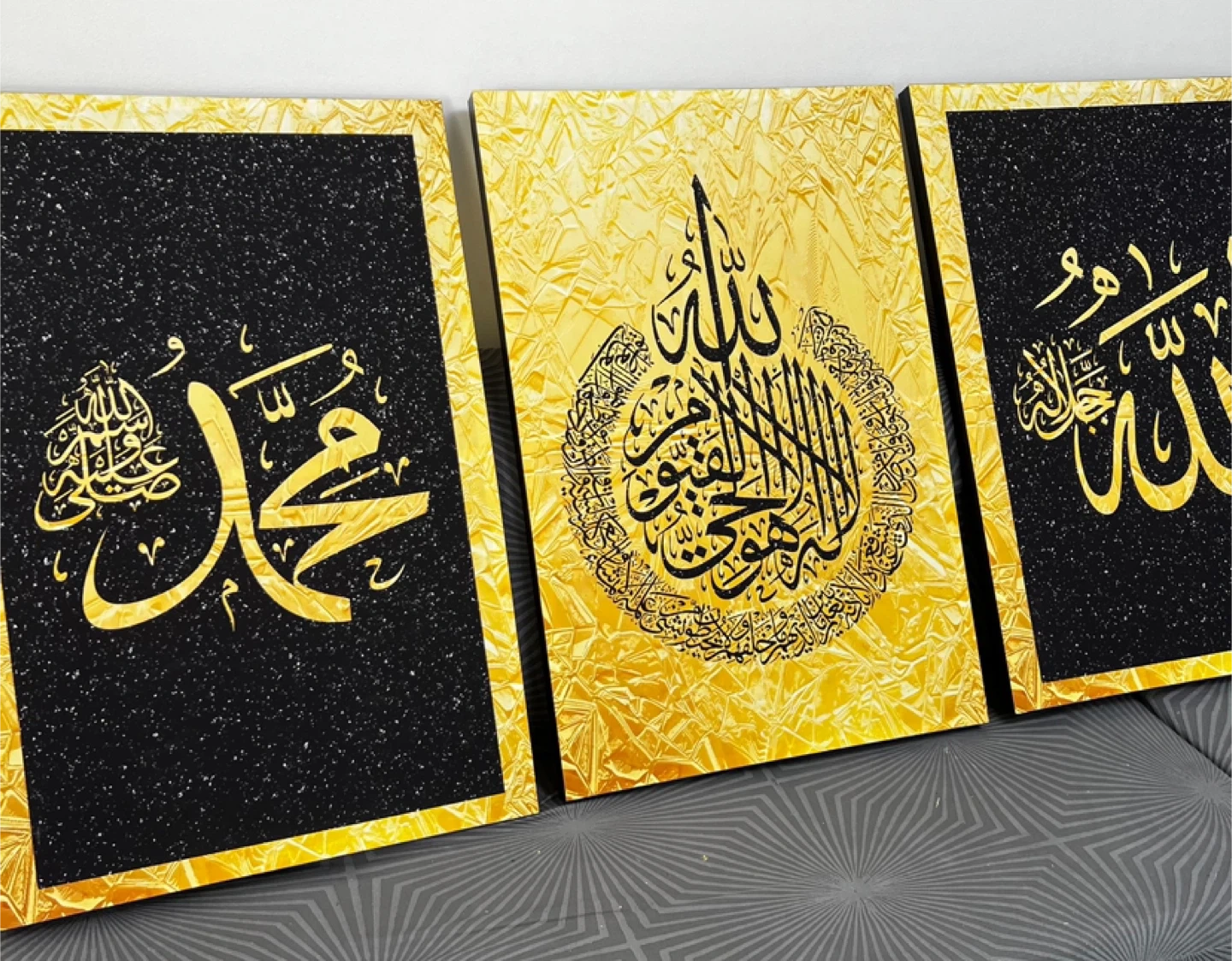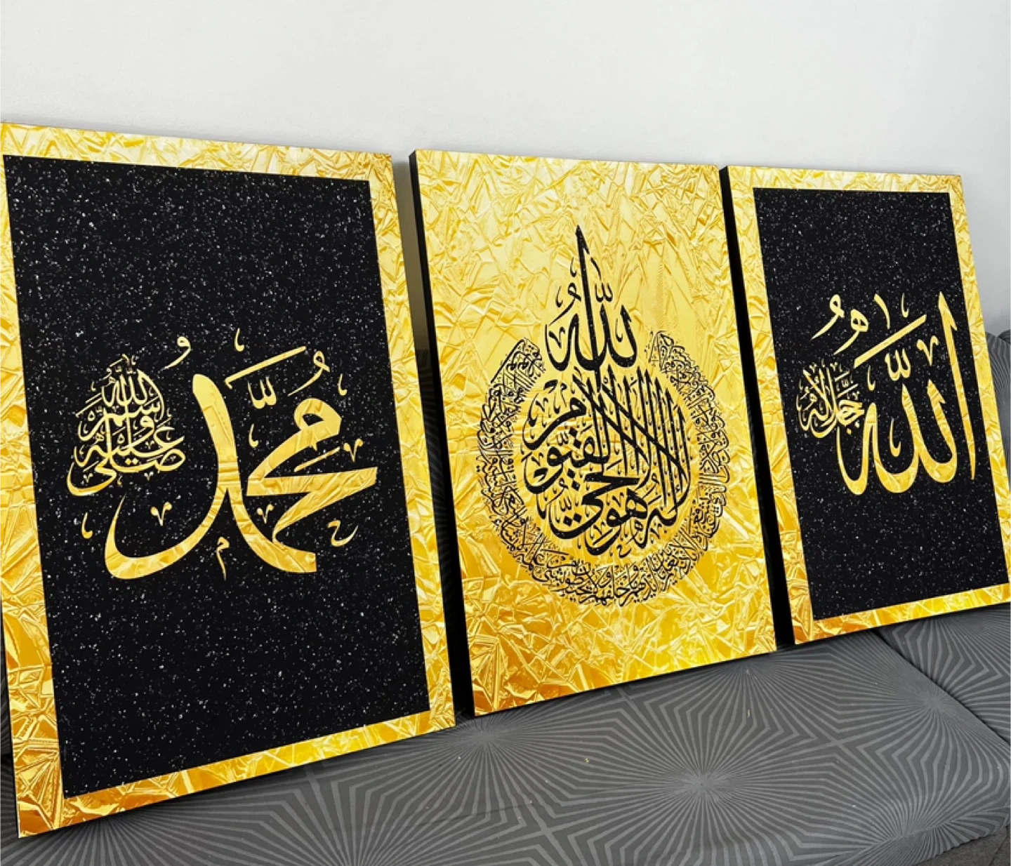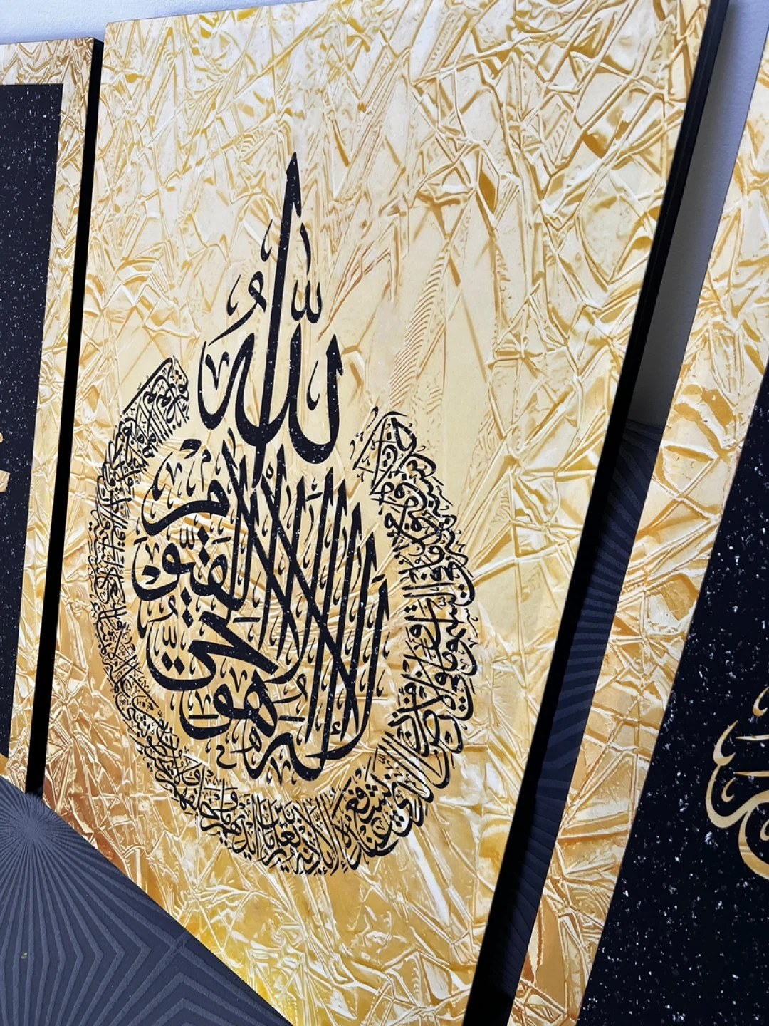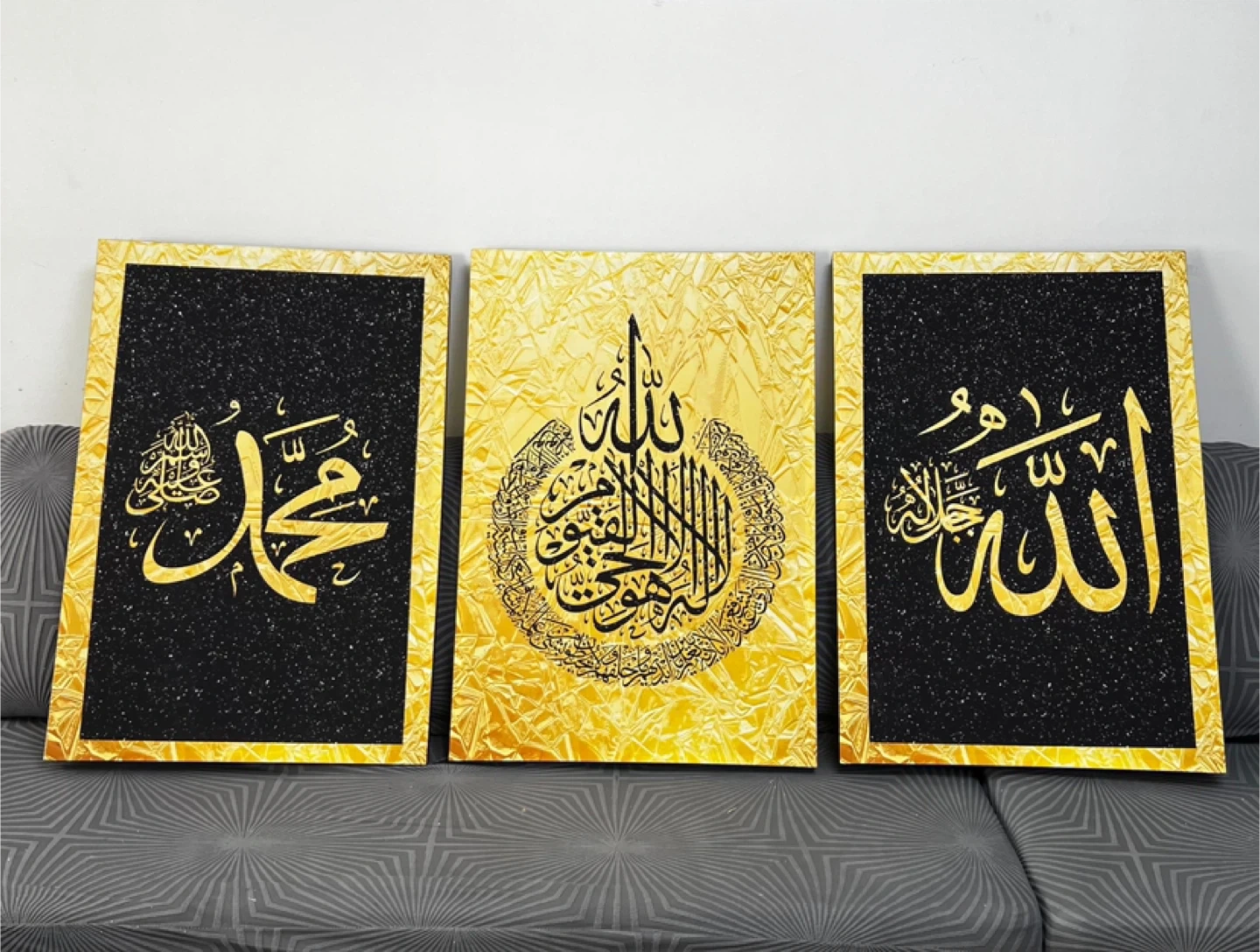 Set of three Islamic calligraphy art pieces featuring Arabic script. Two pieces have black backgrounds with gold speckles, and one features a textured gold background. Each piece measures 23 1/4" wide and 34 1/2" tall. Adds a decorative touch to any space! And perfect for Ramadan gift or Eid gift ☪️