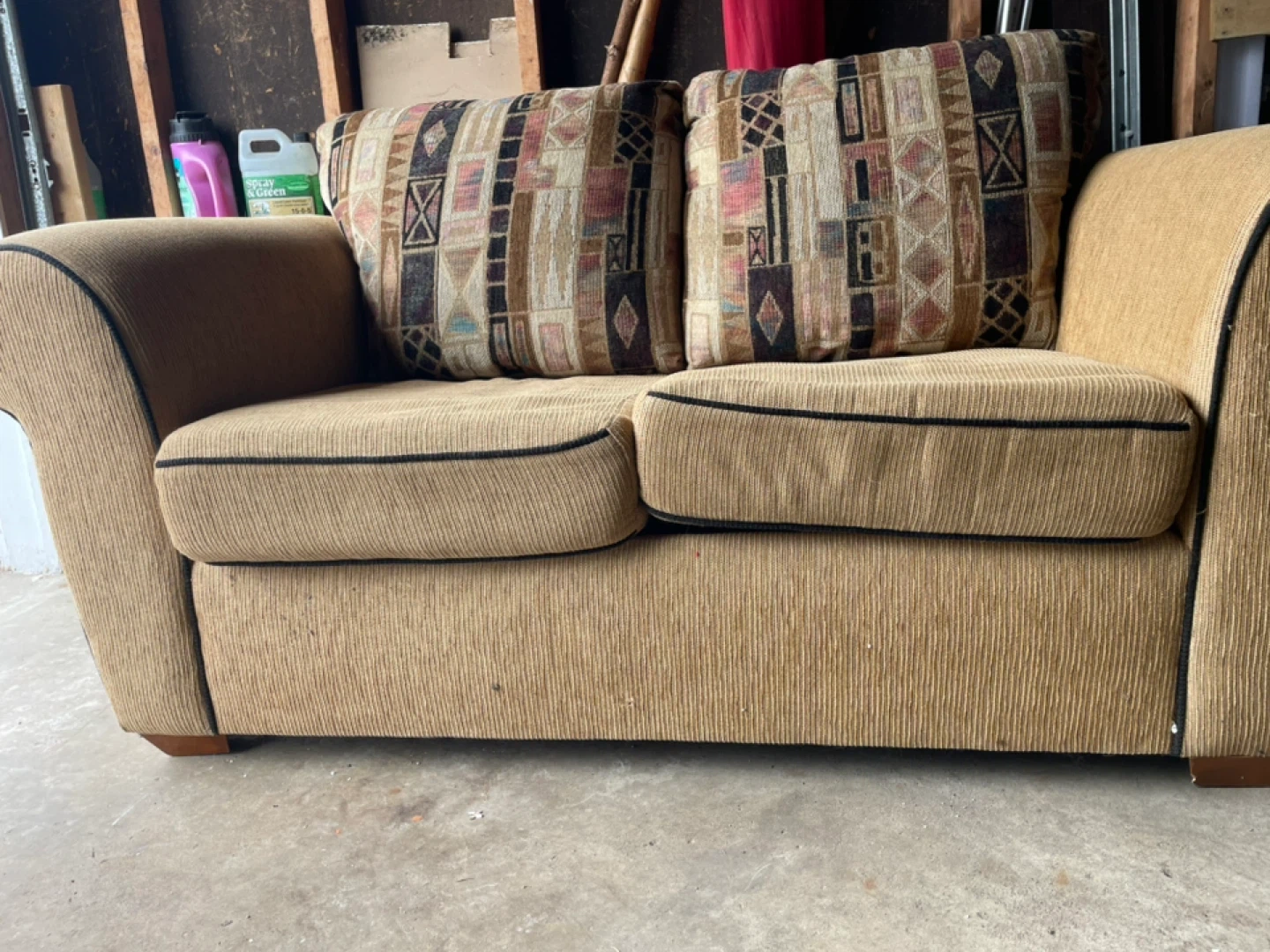 Two-seater loveseat sofa in a ribbed tan fabric. Comes with two throw pillows featuring a geometric pattern. Wood trim accents on the base and arms. In good condition, shows some minor wear. Perfect for a smaller living space or as extra seating.