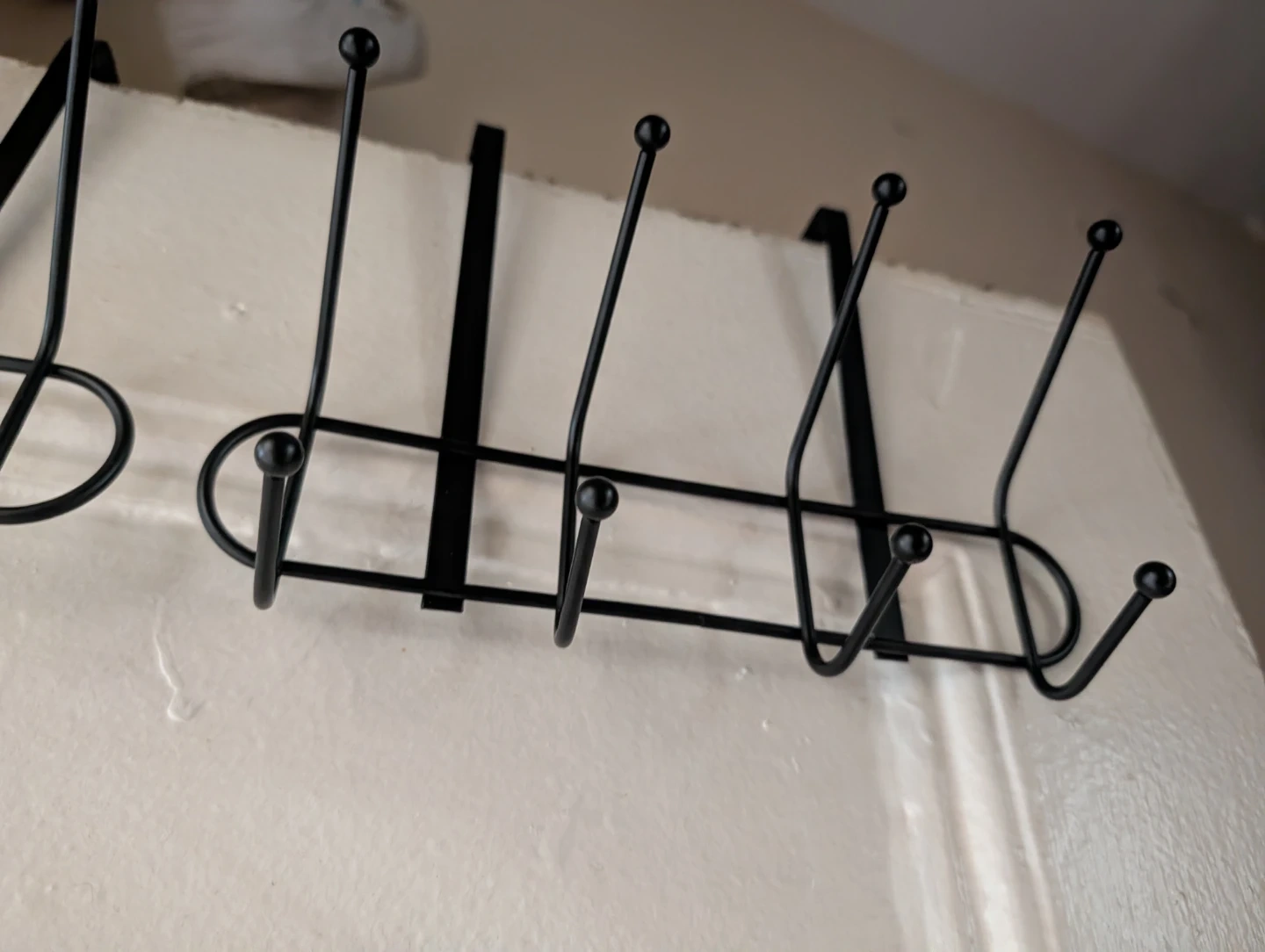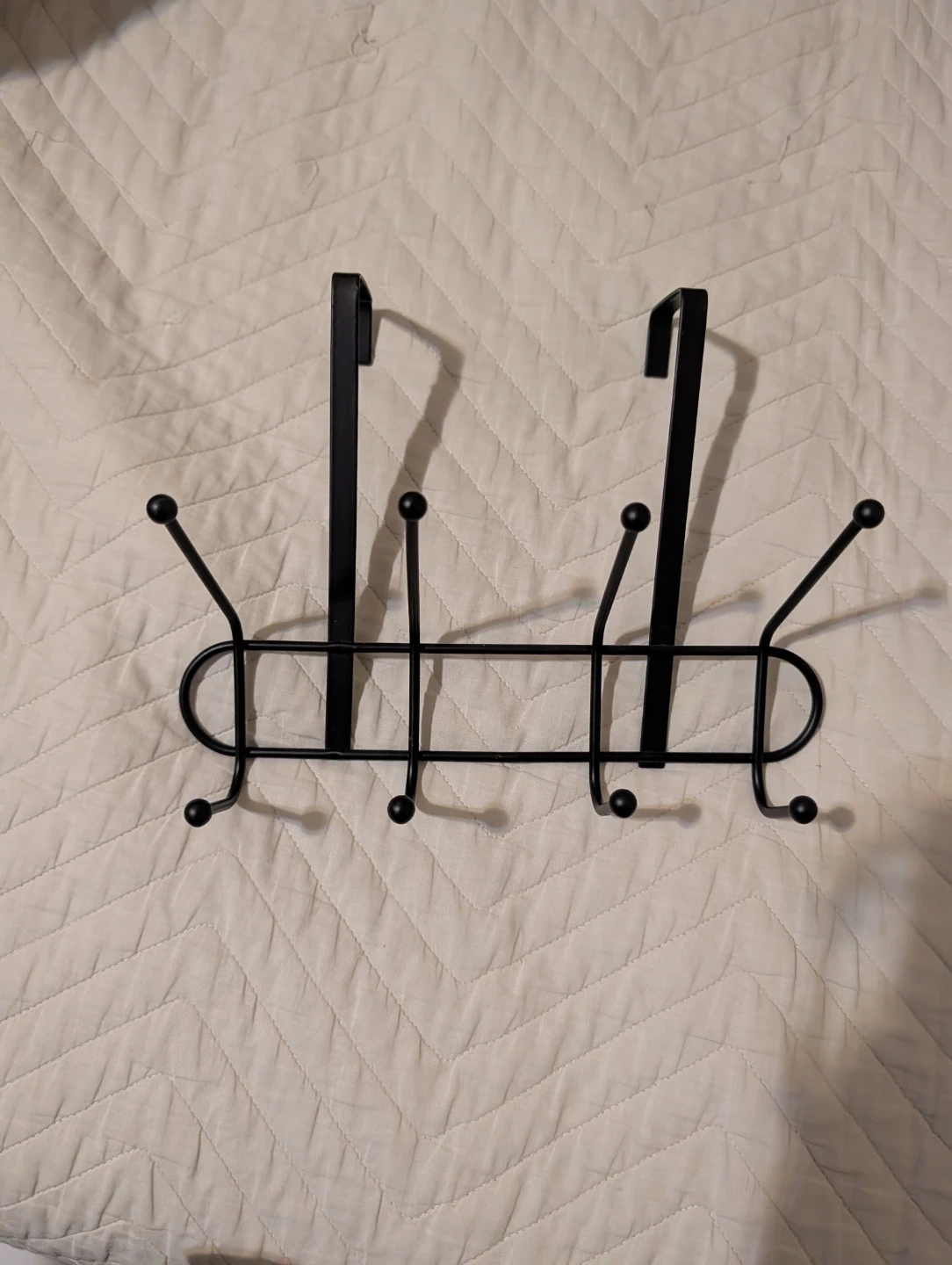 This over-the-door hook rack is made of metal and finished in black. It features six hooks for hanging items. This rack is great for adding extra storage space in closets, bedrooms, or bathrooms without needing to drill holes.