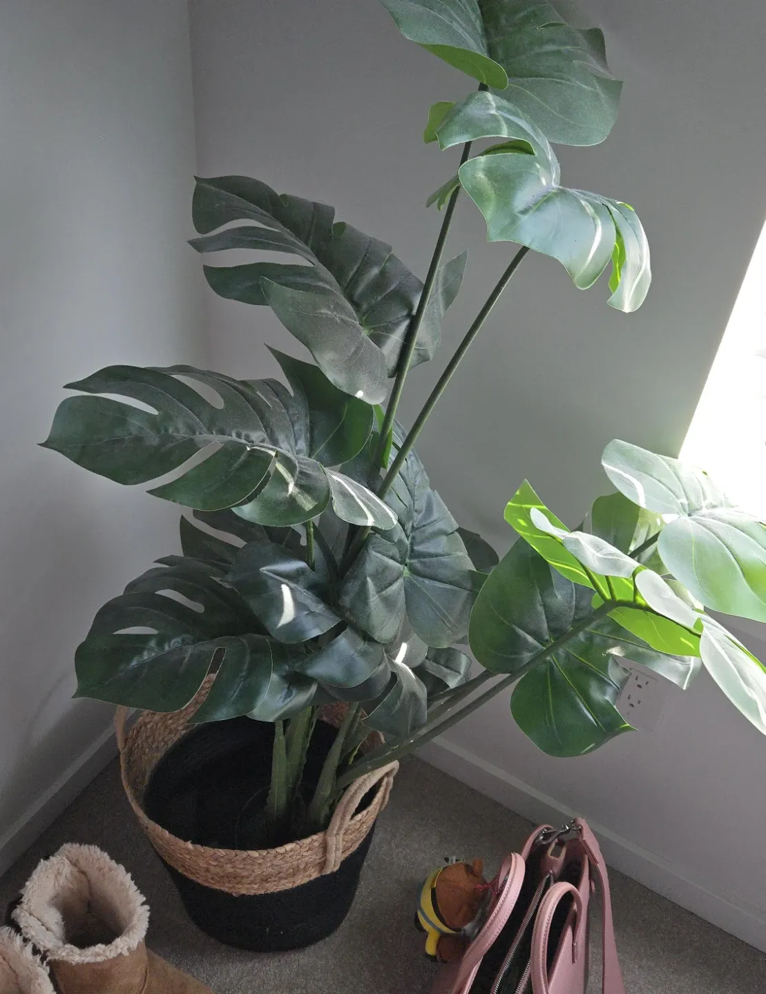 This is a faux Monstera plant with large, split leaves. It comes in a black and natural woven basket with rope handles. The plant is a realistic green colour. It's perfect for adding some greenery to any room without the need for watering!