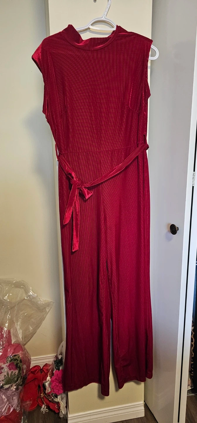This elegant red jumpsuit features a ribbed velvet texture and a flattering tie belt. Sleeveless design with a mock neck collar. It's perfect for a night out or special occasion!
