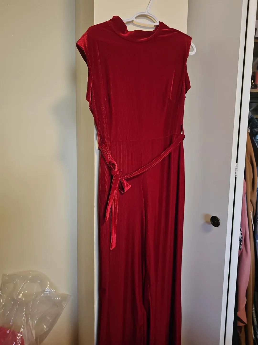 Red Ribbed Velvet Jumpsuit with Belt