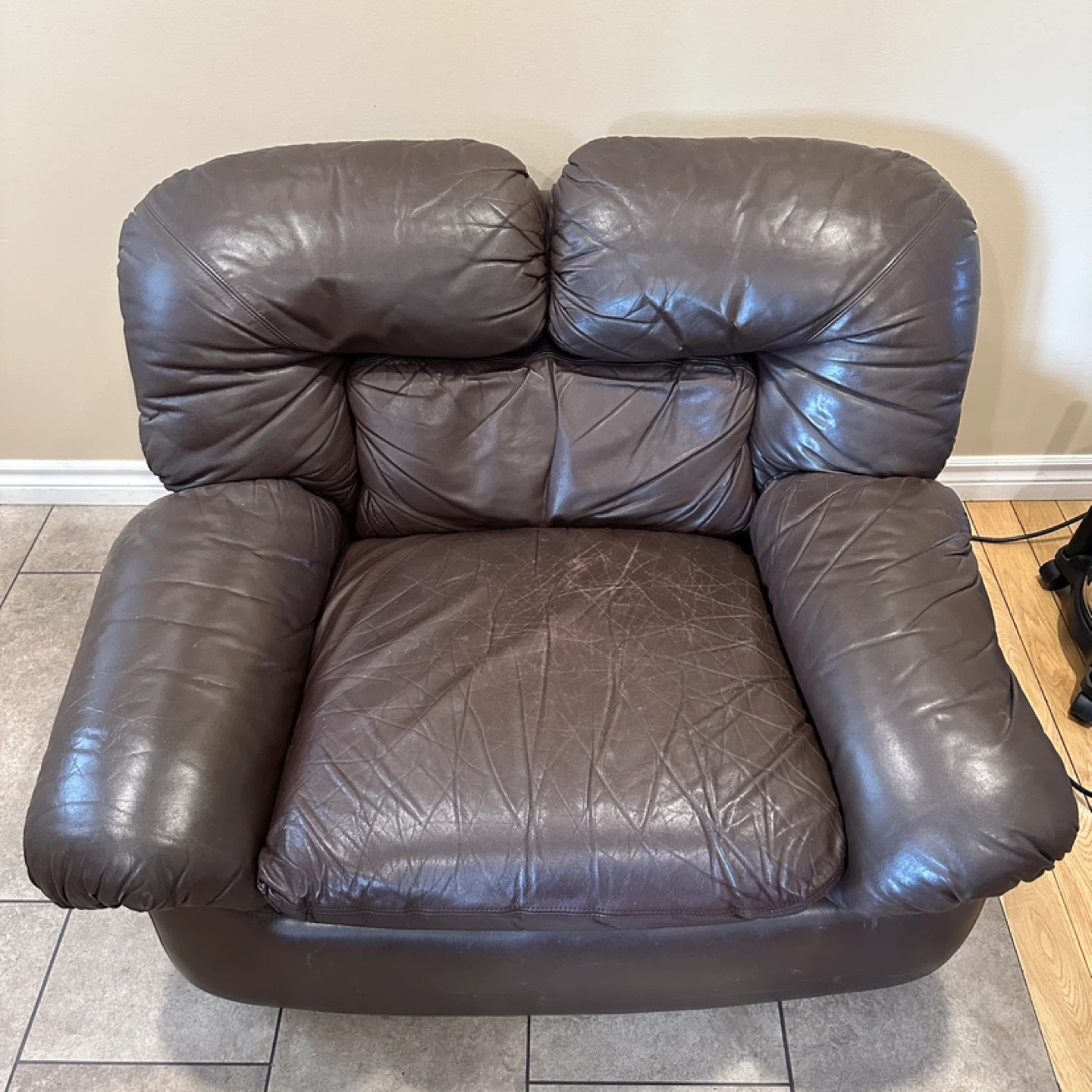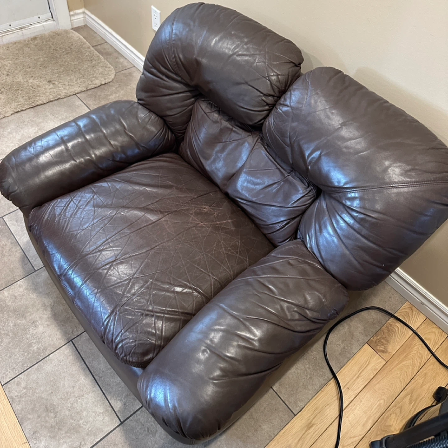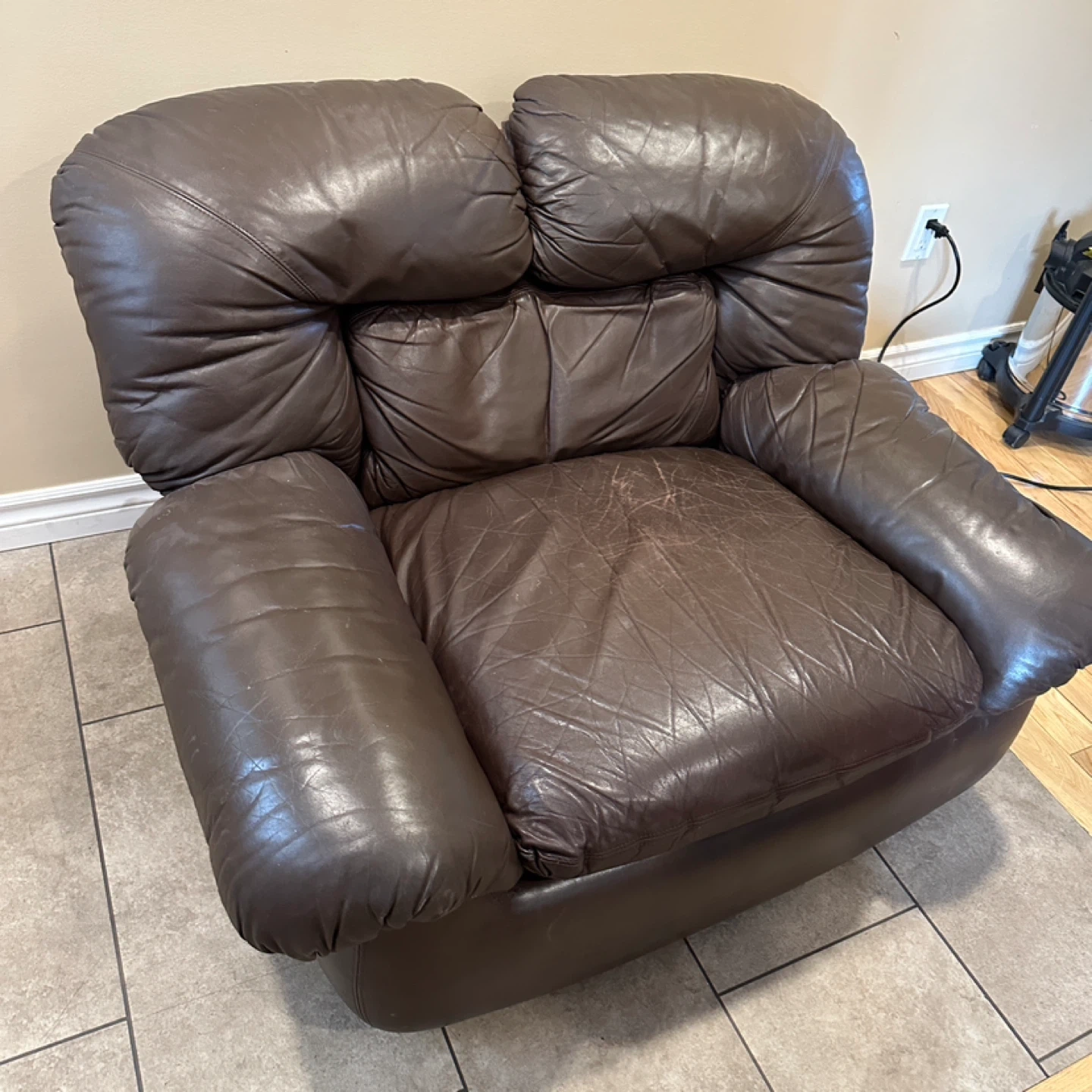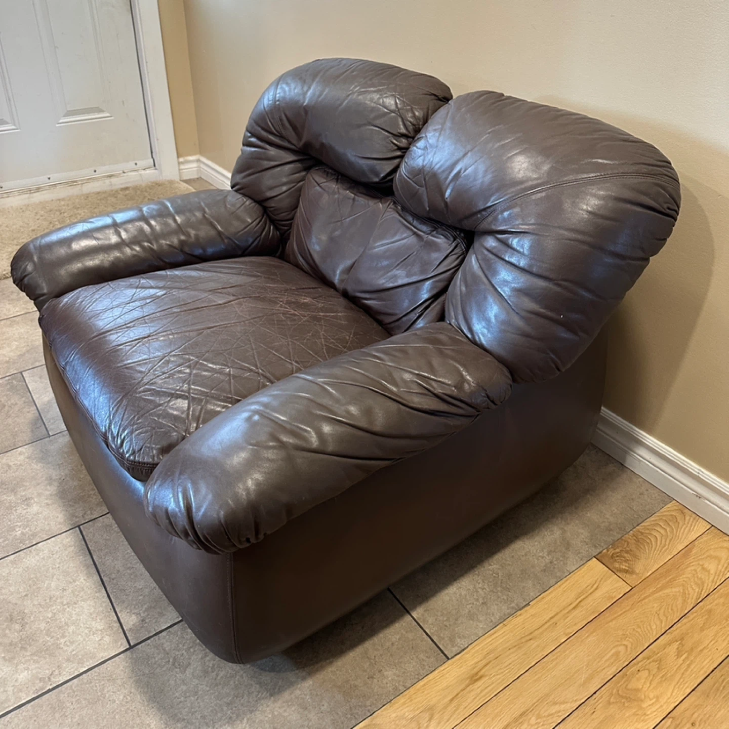 Oversized genuine leather lounge chair in a rich brown colour. Super comfortable with deep seating and wide arms. Great for a living room, basement, or lounge space. 🌟CAN DELIVER FOR SMALL FEE🌟 PRICE: $100 Measurements: 42”W × 35”D × 30”H ✅Shows consistent leather wear with age (Shown in pictures) Highlights: • Genuine leather • Oversized “chair-and-a-half” design • Very comfortable deep seat • Solid, heavy construction