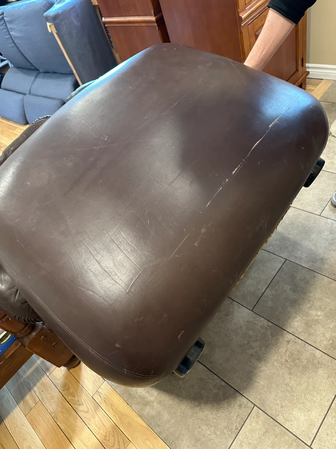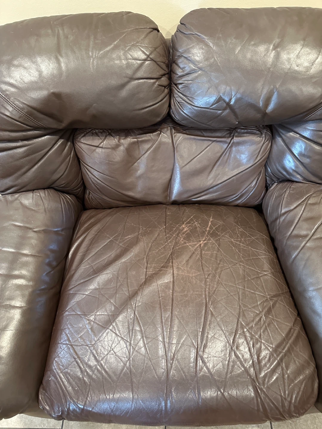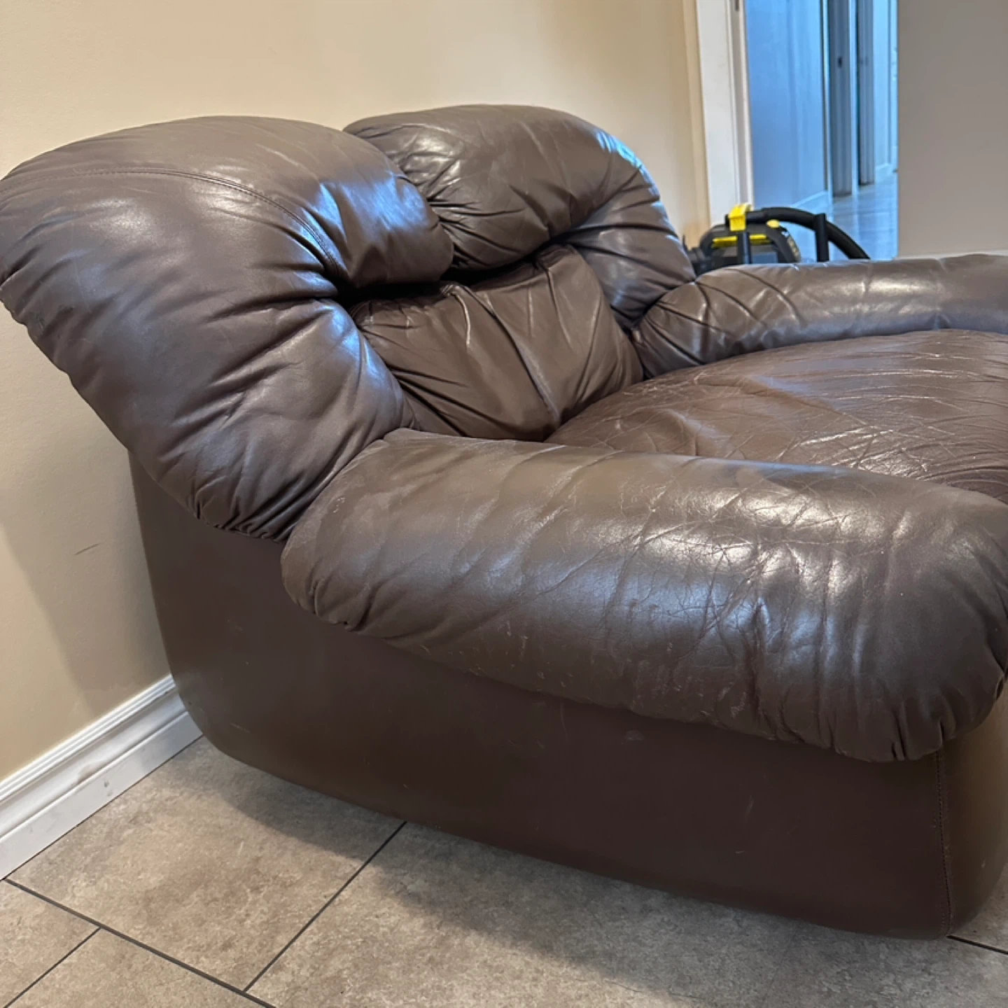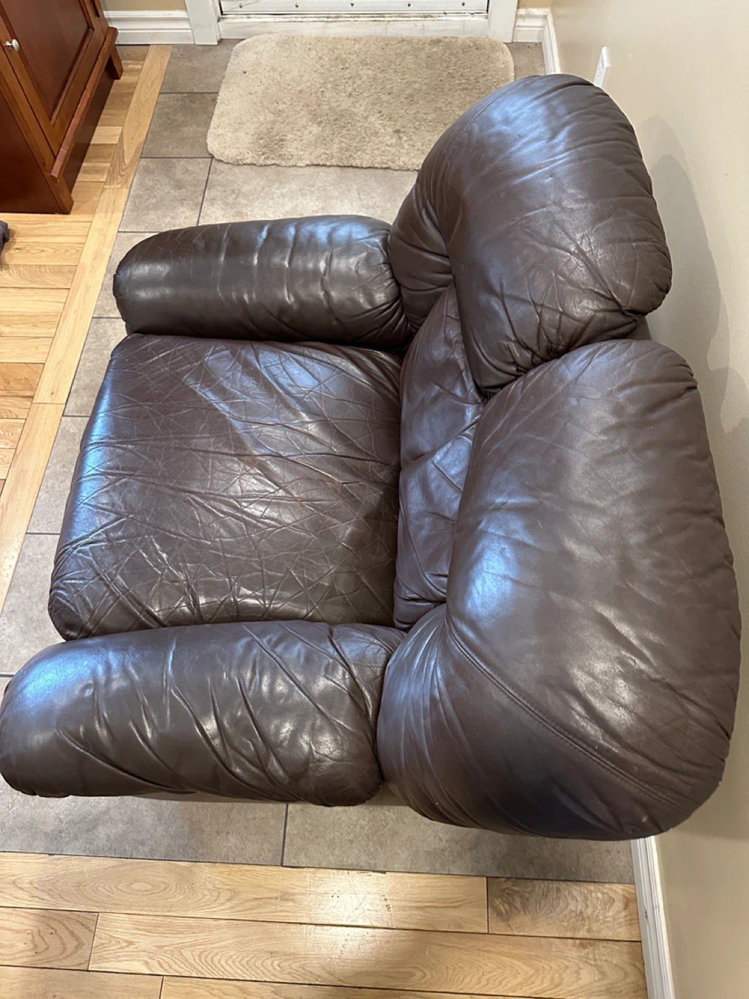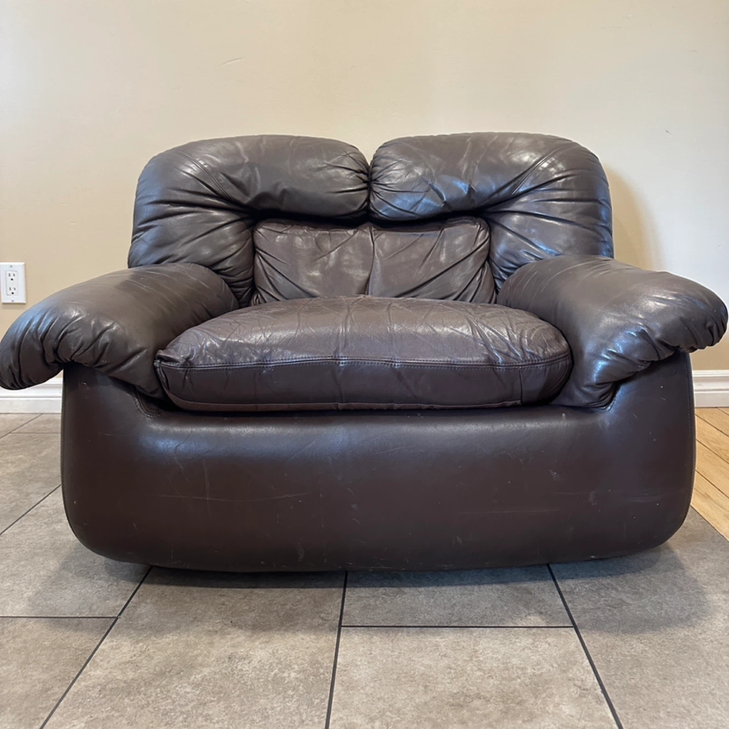 Oversized genuine leather lounge chair in a rich brown colour. Super comfortable with deep seating and wide arms. Great for a living room, basement, or lounge space. 🌟CAN DELIVER FOR SMALL FEE🌟 PRICE: $100 Measurements: 42”W × 35”D × 30”H ✅Shows consistent leather wear with age (Shown in pictures) Highlights: • Genuine leather • Oversized “chair-and-a-half” design • Very comfortable deep seat • Solid, heavy construction