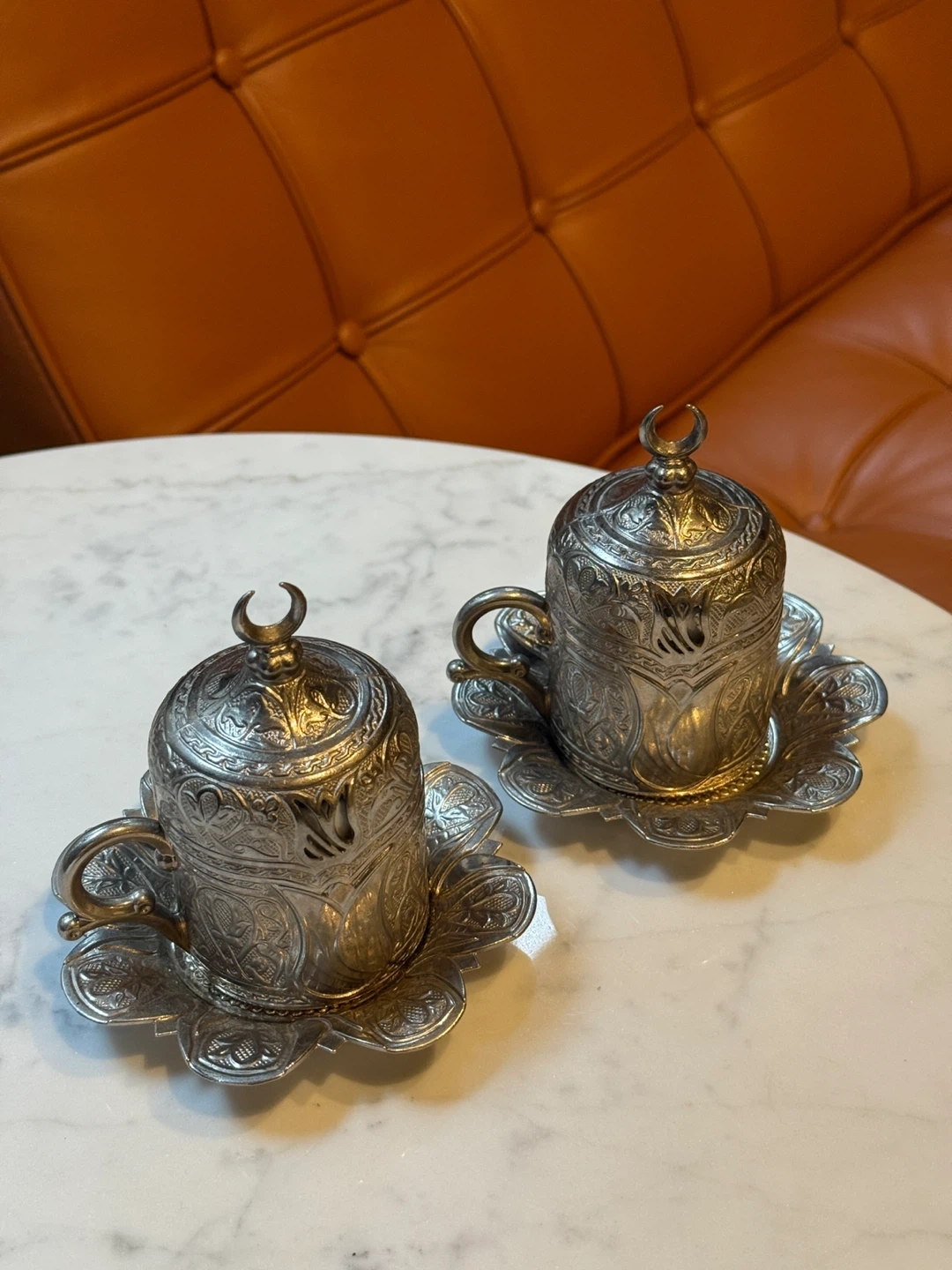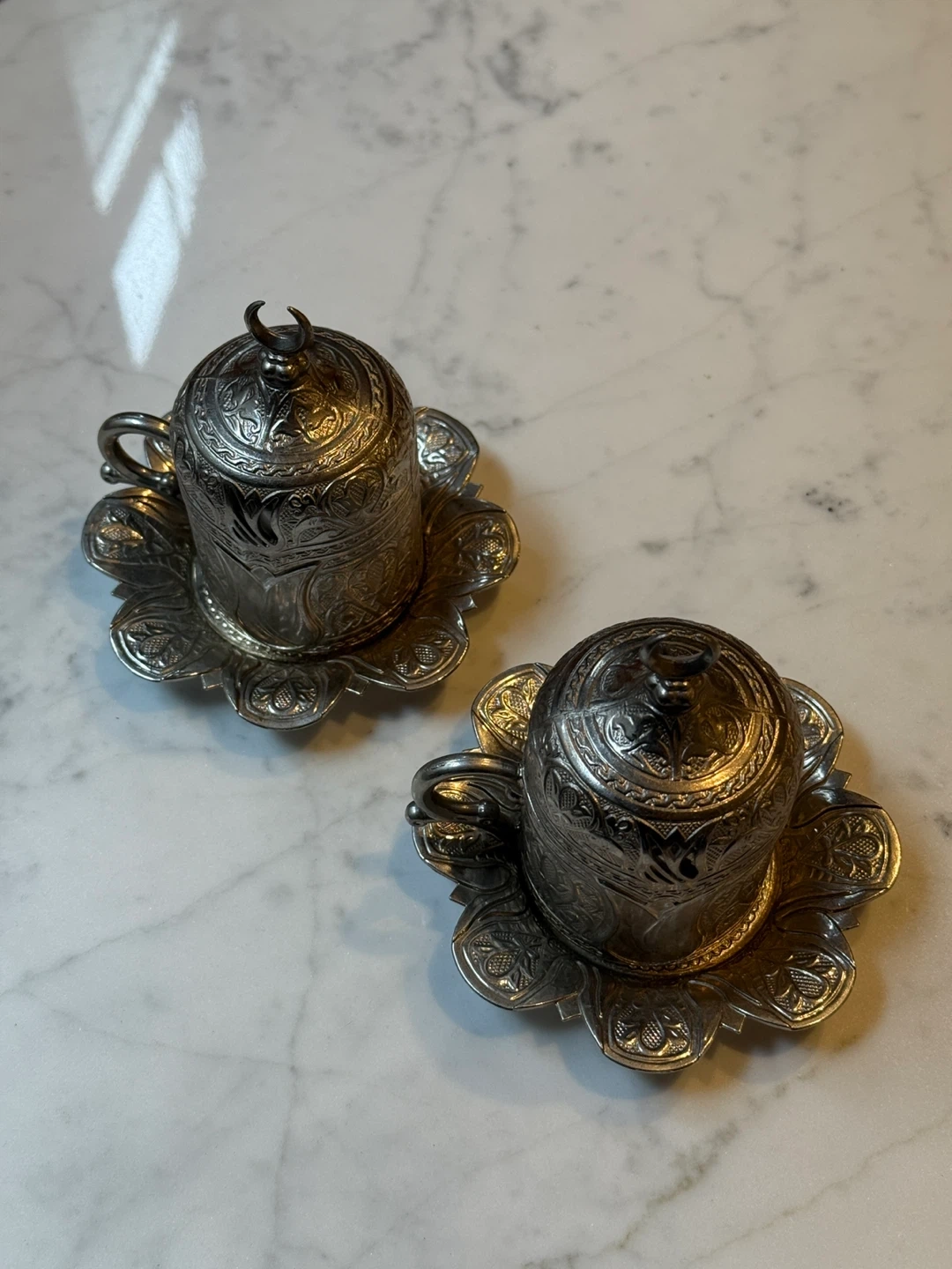 These two ornate Turkish coffee cups come with matching saucers and lids. They're crafted from metal with intricate embossed designs. The cups feature white ceramic inserts for drinking. A beautiful addition to any coffee lover's collection!