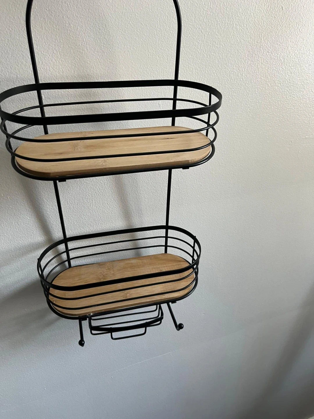 Here's a handy shower caddy to keep your essentials organized! It features a black metal frame with two wooden shelves, perfect for holding shampoo, conditioner, and other bath items. Great for adding some extra storage to your shower