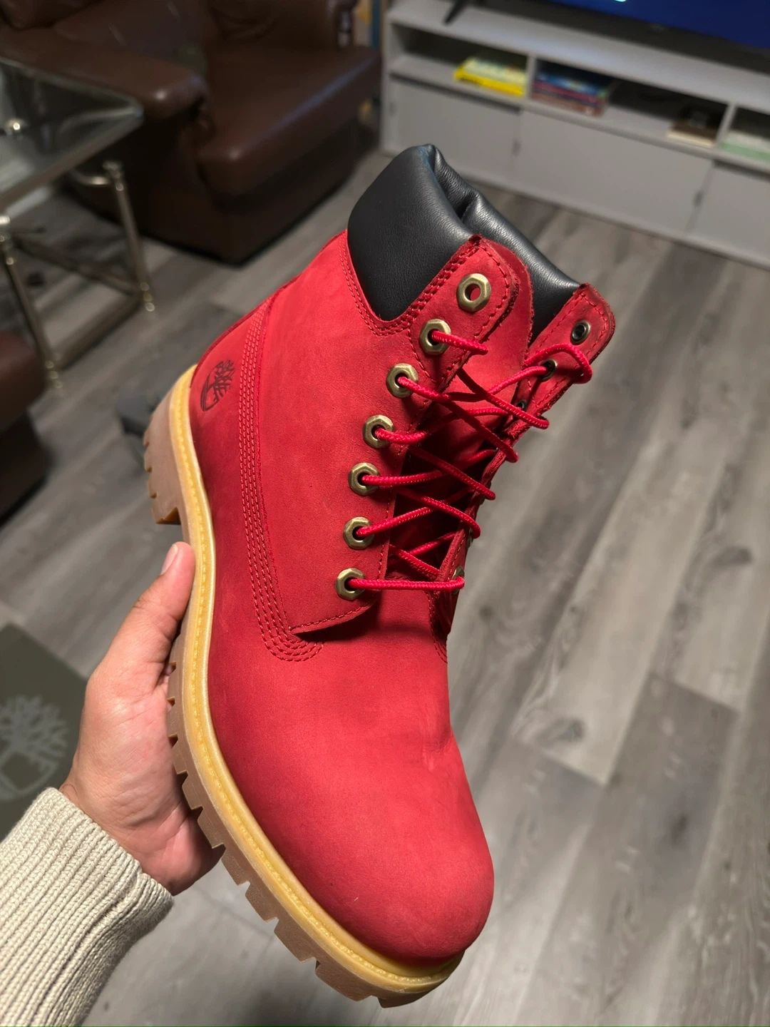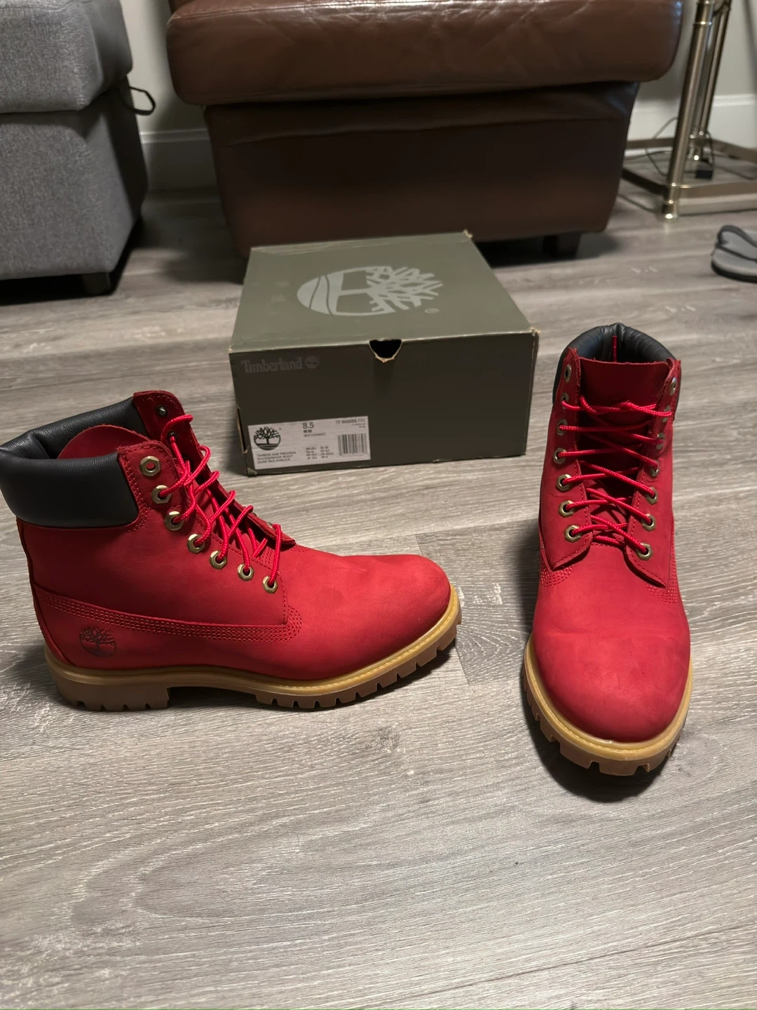 Selling my red Timberlands. I picked these up mid-last year but only ended up wearing them maybe 7 or 8 times total. They’ve mostly just been sitting in the closet, so they’re still in great shape and have a ton of life left in them.