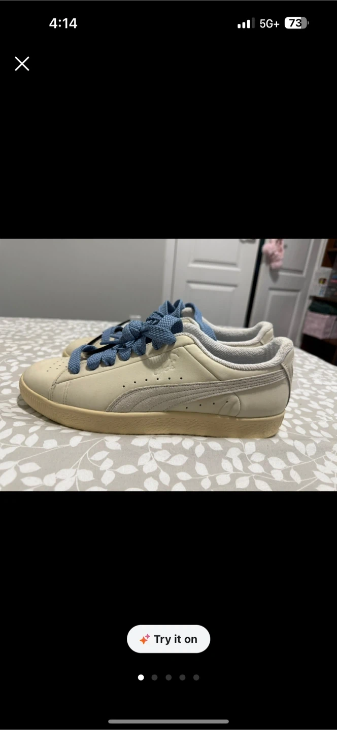 Just worn 2 3 times Cream-coloured Puma Clyde Nostalgia sneakers with light blue laces. Suede and leather upper.
