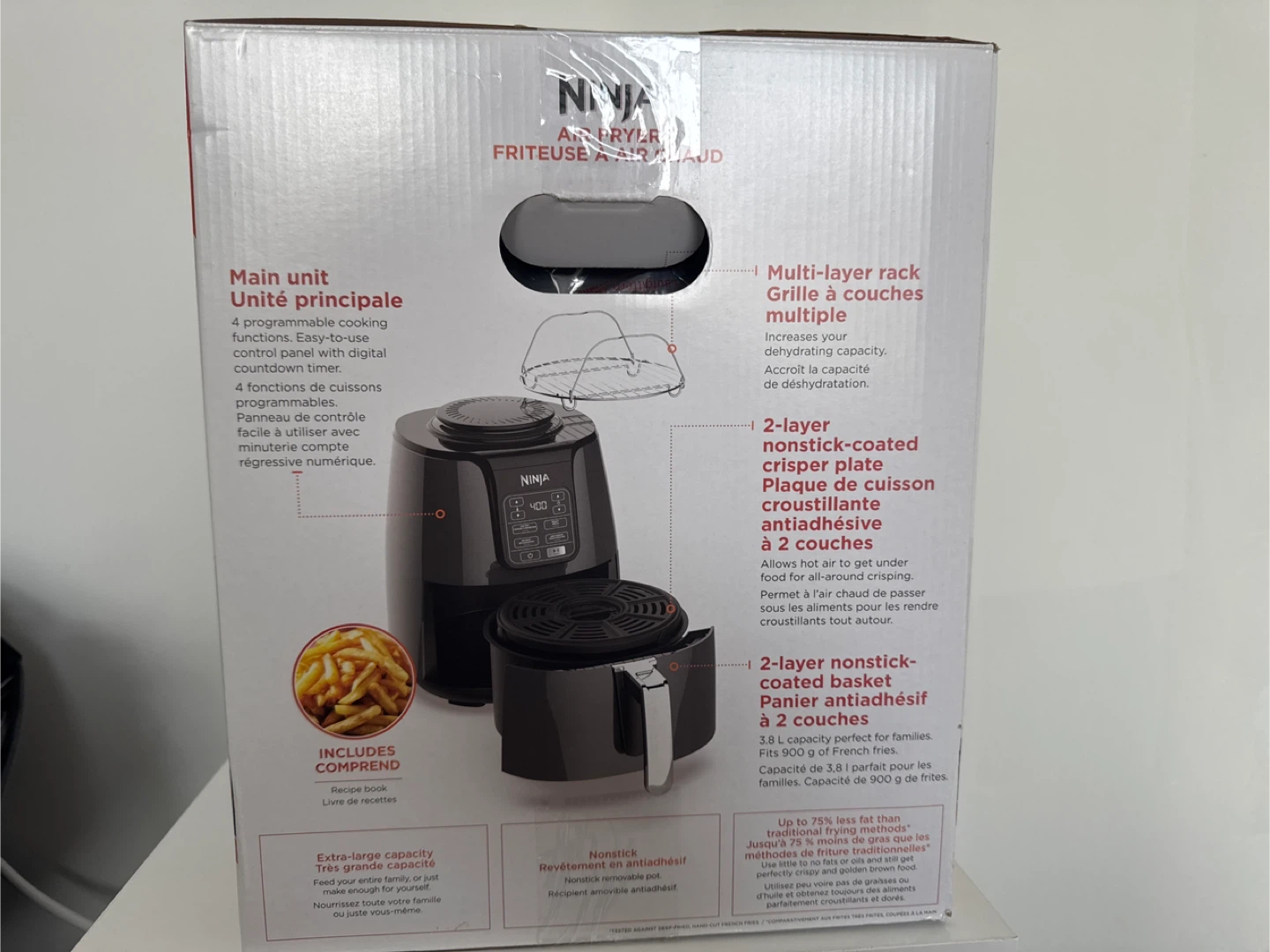 This Ninja Air Fryer has a 3.8 L capacity and includes a multi-layer rack and a 2-layer nonstick crisper plate. It offers 4 programmable cooking functions for versatile meal preparation. Great for making healthier versions of your favourite fried foods!